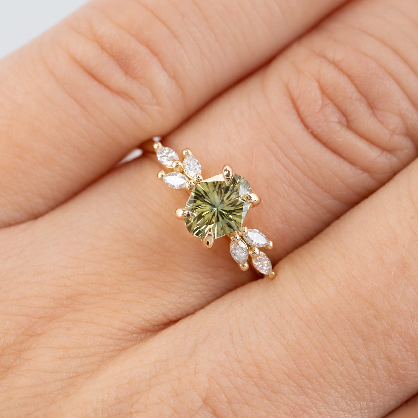 This spectacular new ring features a central 'Universe' cut green and yellow sapphire, cut by award winning lapidary Sennin Esko. The sapphire has been set with 6 marquise accent lab grown diamonds, in a flowing, floral inspired 18ct yellow gold mount.
