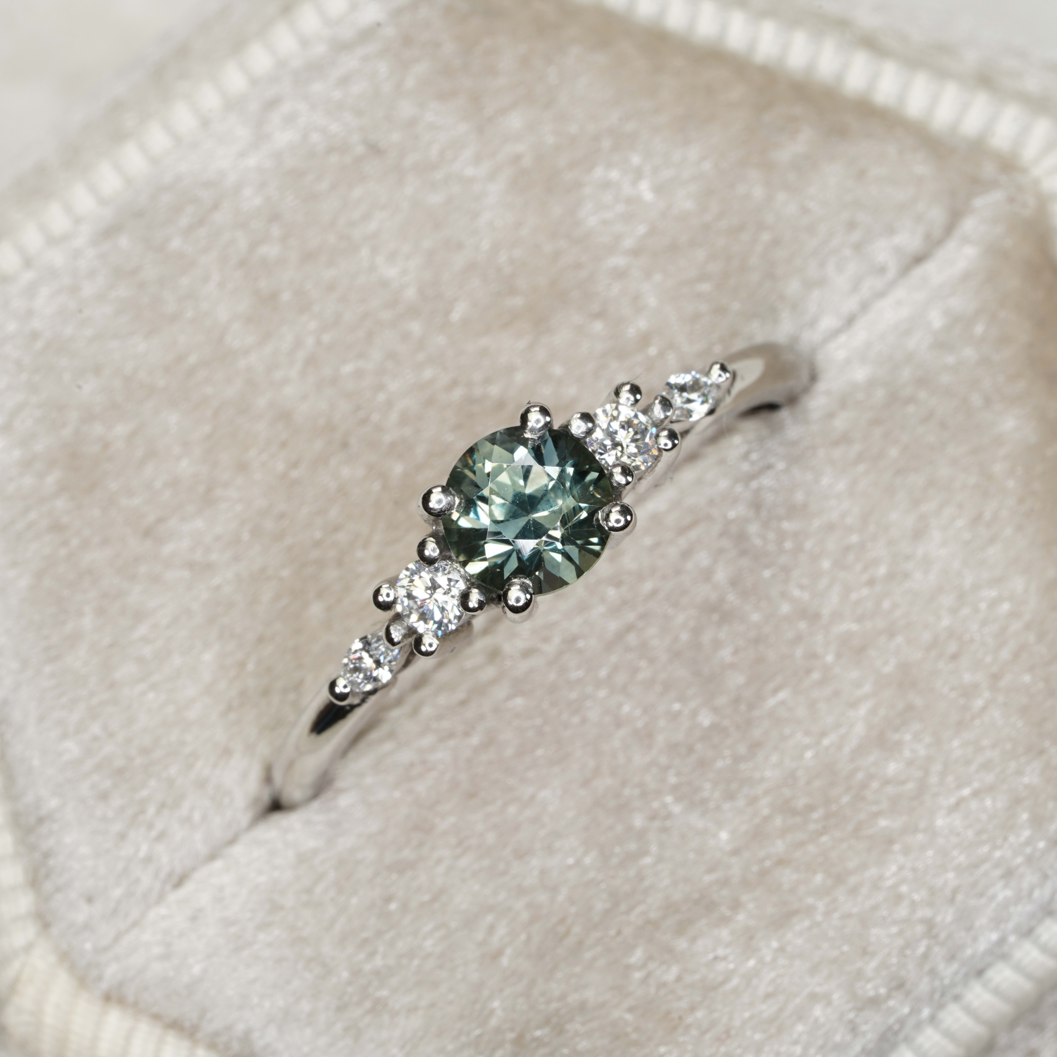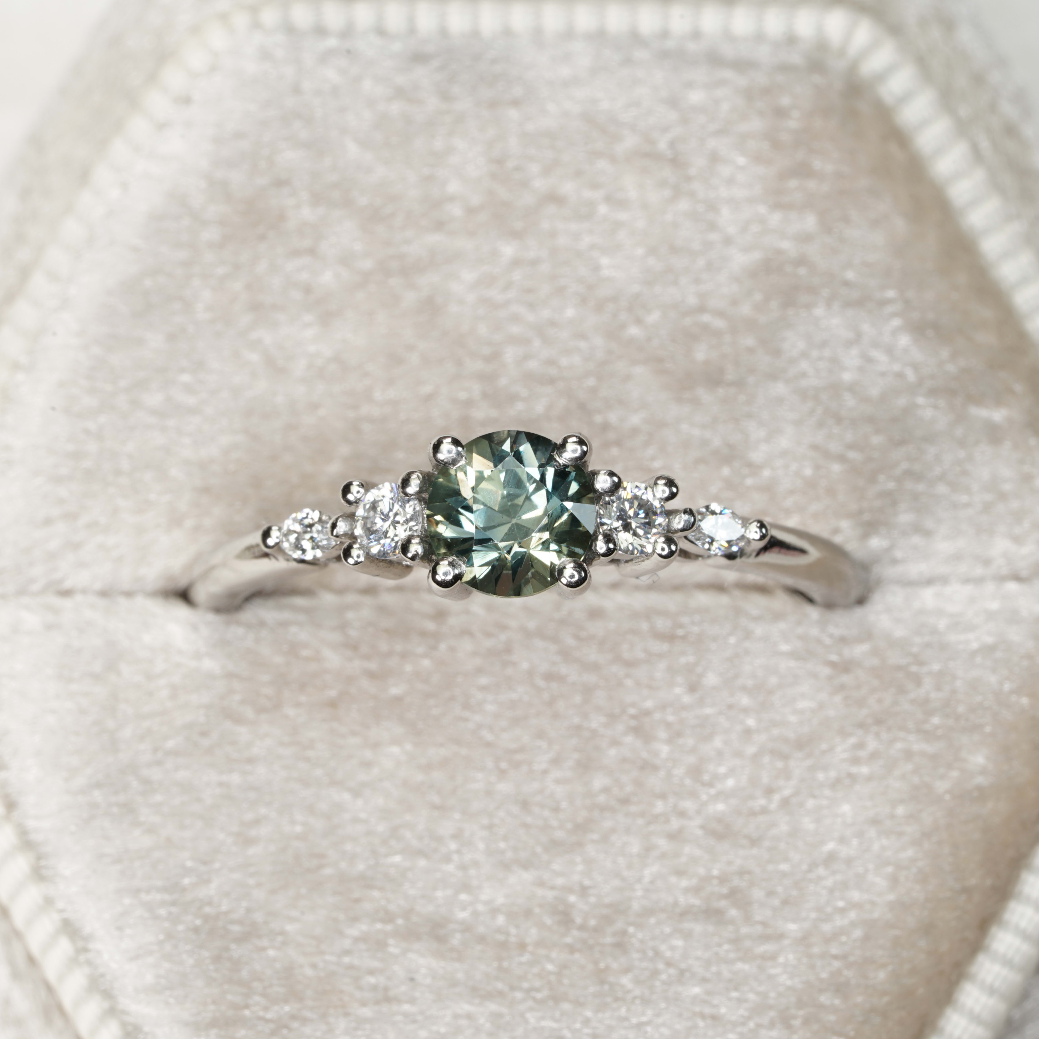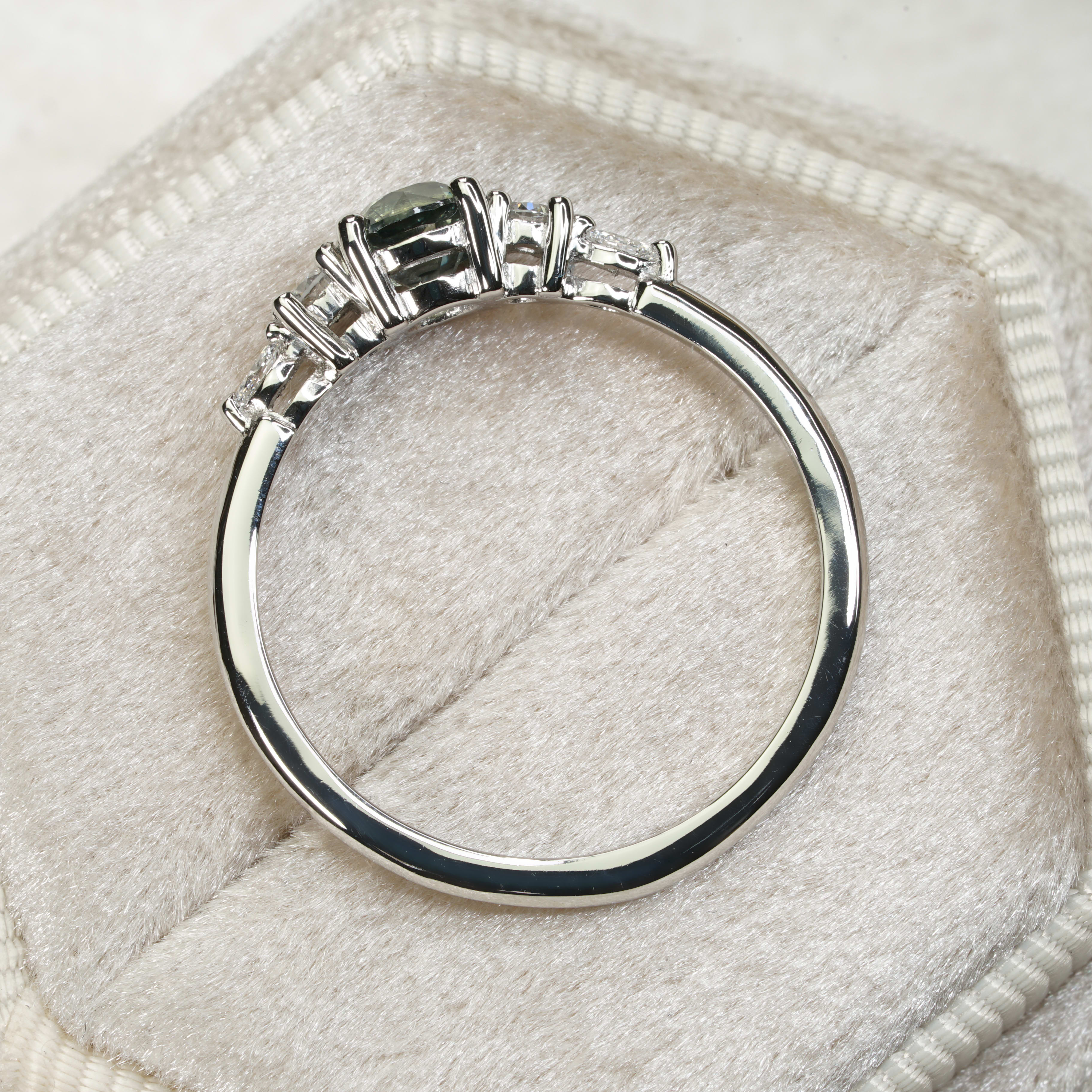This elegant ring features a central 0.66ct smoky teal sapphire. The sapphire has been 4 prong set with two round brilliant and two marquise lab diamonds in a classic 5 stone platinum setting!