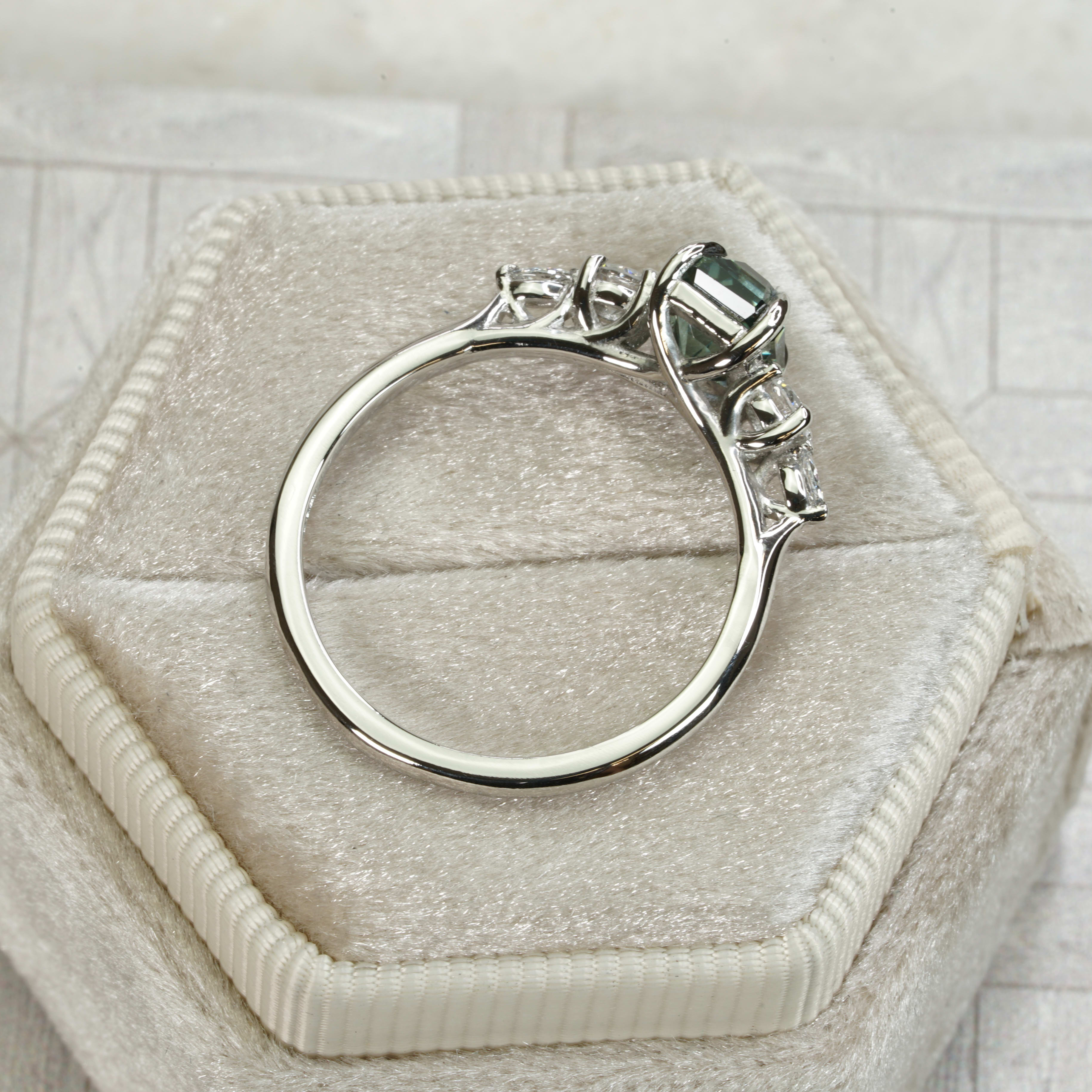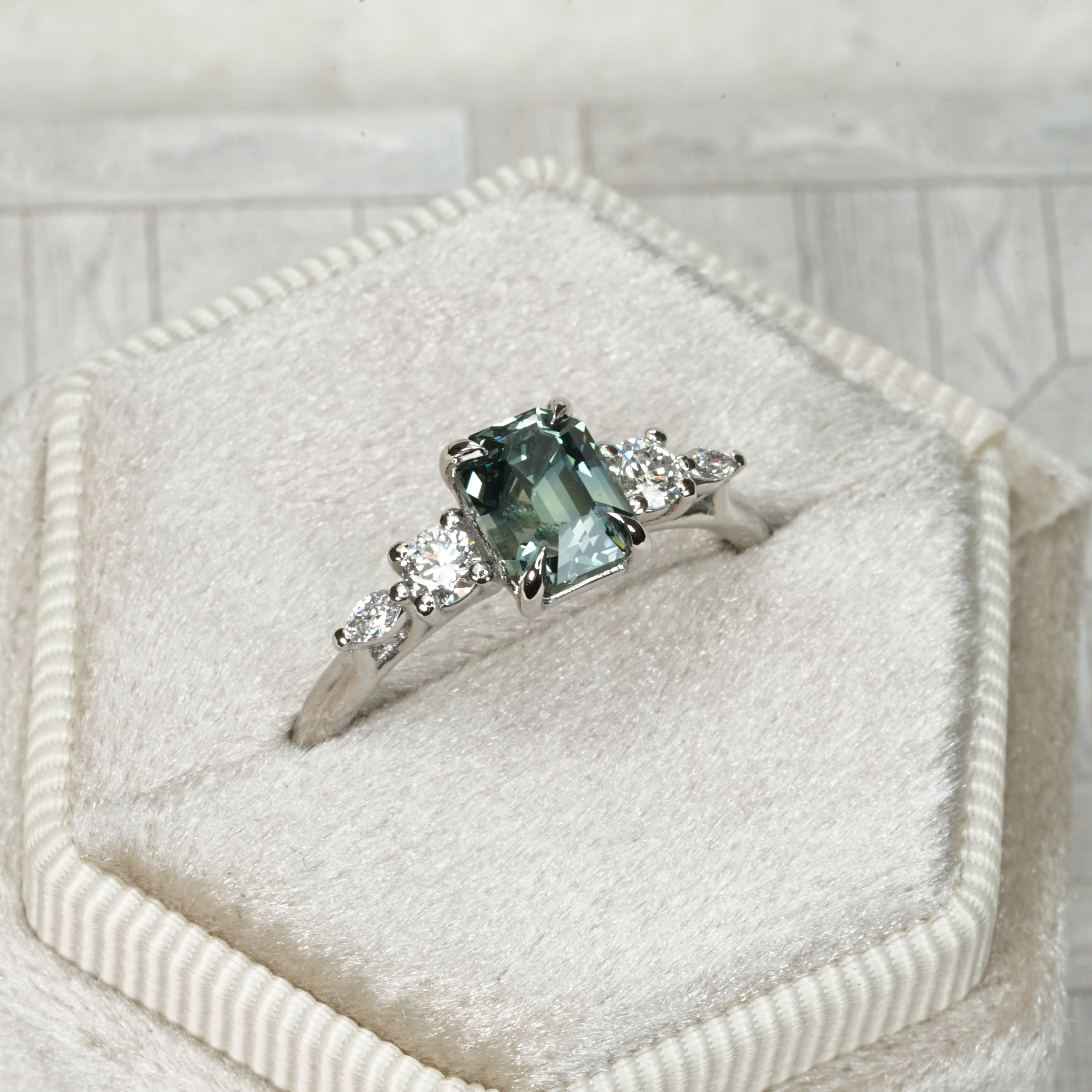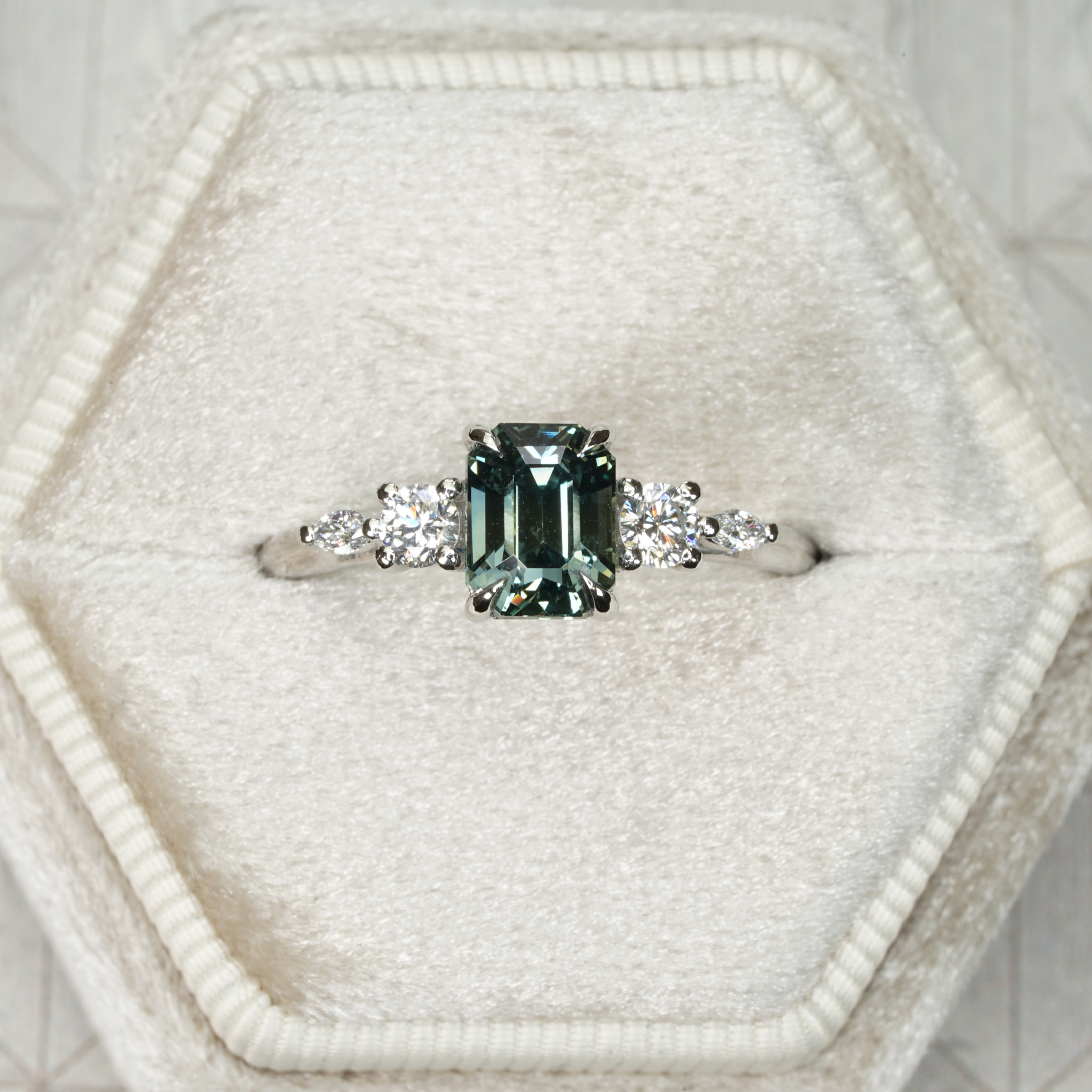 This brand new stunning ring features a central 1.77ct, emerald cut smoky teal sapphire. The sapphire is flanked with round and marquise lab grown diamonds, all in a gorgeous platinum weaving trellis style setting!