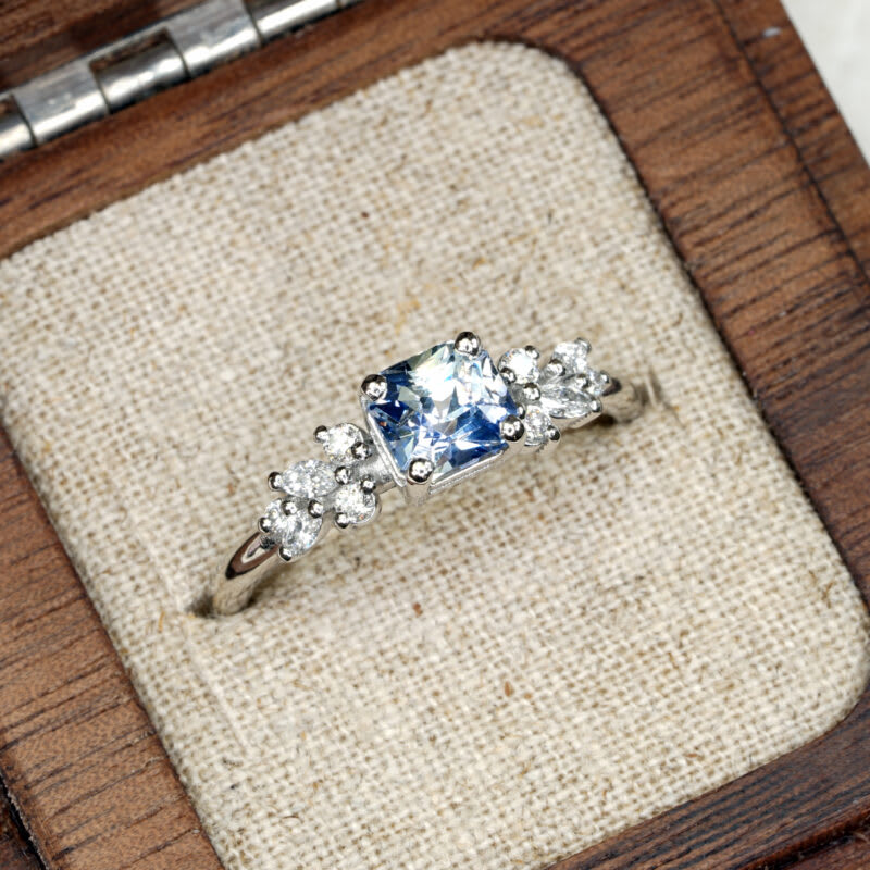 This brand new stunning ring features a central natural 1.30ct square radiant cut icy blue sapphire. It has been 4 prong set with a floral arrangement of marquise and round brilliant cut diamonds, in a low profile platinum mount!