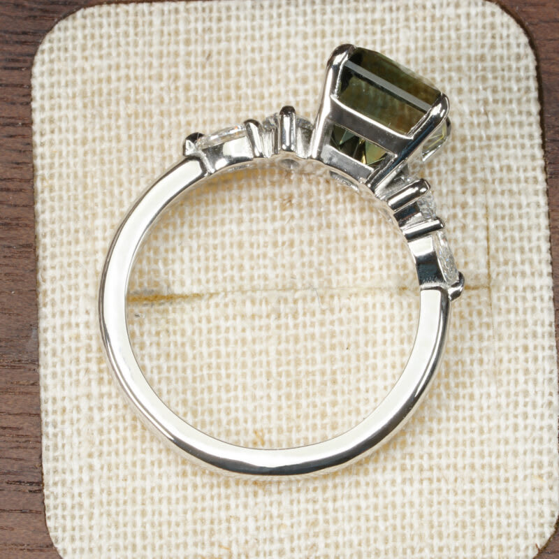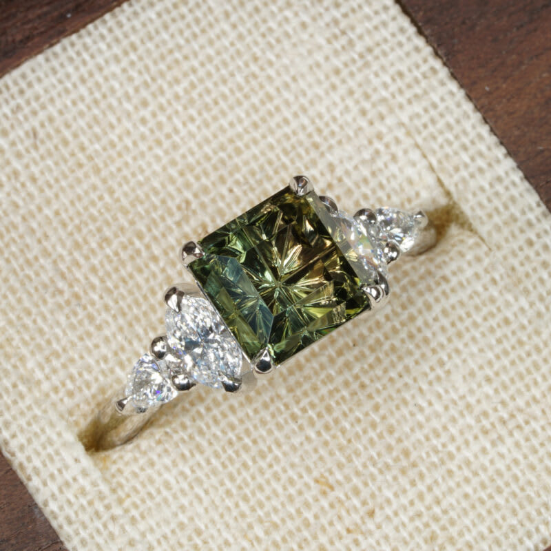 This gorgeous ring features a totally unique 'Starbrite' square cut green Tourmaline, carved by award winning gem cutter John Dyer! The tourmaline features a unique bi-colouration, with hues transitioning from olive green/wood brown, to forest green. The stone been talon set to follow the lines of the Starbrite cut. We then accented the gem with graduating oval and pear lab grown diamonds that also feature matching talon settings. The whole ring is made in platinum to bring out the striking colour of the Tourmaline. Jewels: Tourmaline, Lab grown diamonds Tourmaline: 3.01ct, 7.2 mm x 7.2 mm, square 'Starbrite' cut, VS clarity, unheated (Nigerian origin) Lab grown Diamonds: 0.56 carats total, VVS clarity, E/F colour Size: M Metal: platinum