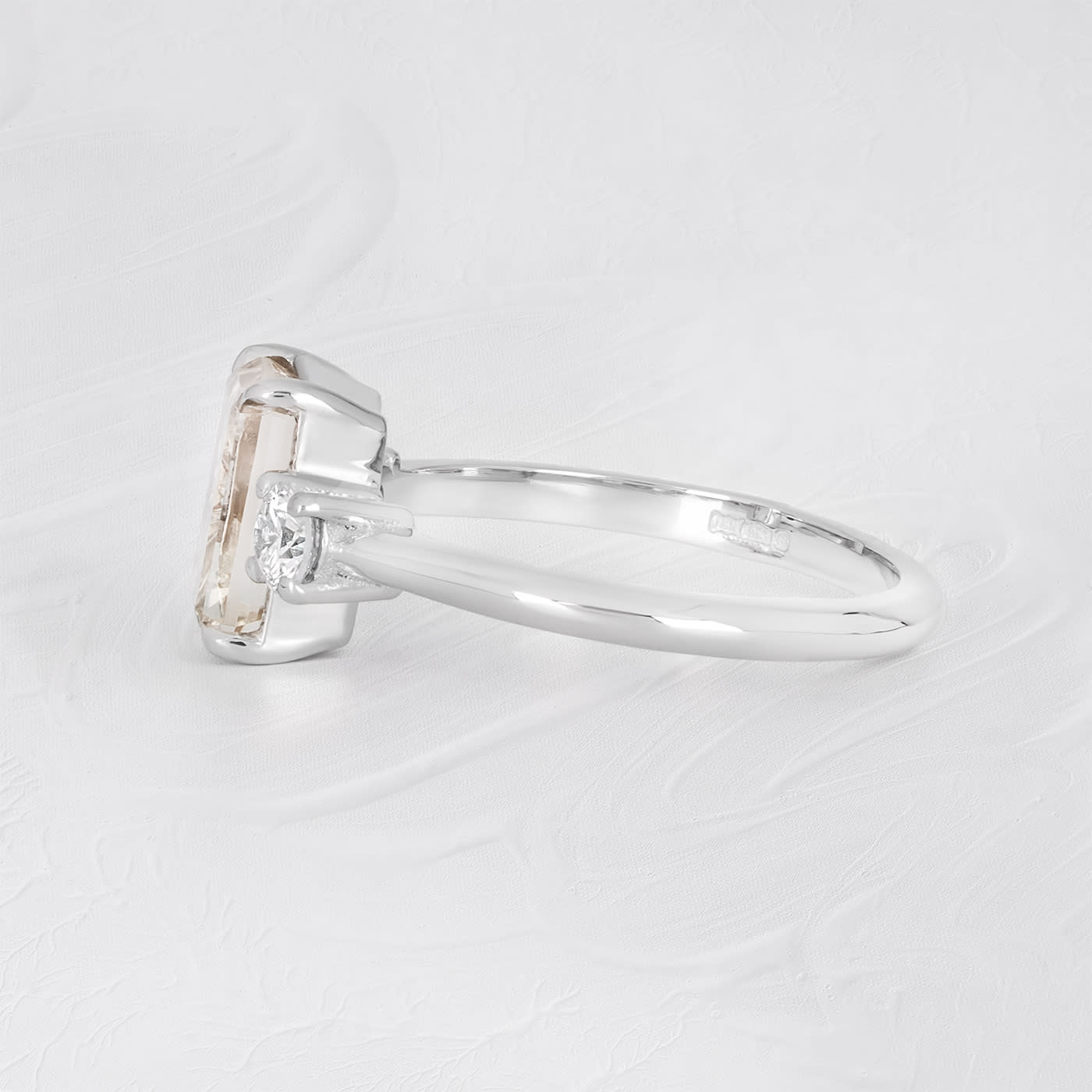This gorgeous ring features a totally unique 'Starbrite' cut light peach Tourmaline, carved by award winning gem cutter John Dyer! It is placed in a beautiful low profile diamond trilogy setting, with a subtle milgrain boarder to compliment the Tourmaline, all in platinum. Jewels: Tourmaline, Lab grown diamonds Tourmaline: 2.15ct, octagon 'Starbrite' cut by John Dyer, 8.80x6.30mm, pale peach, VS clarity, unheated (Congo origin) Lab grown Diamonds: 0.3 carats total, VVS clarity, E/F colour Size: P Metal: platinum