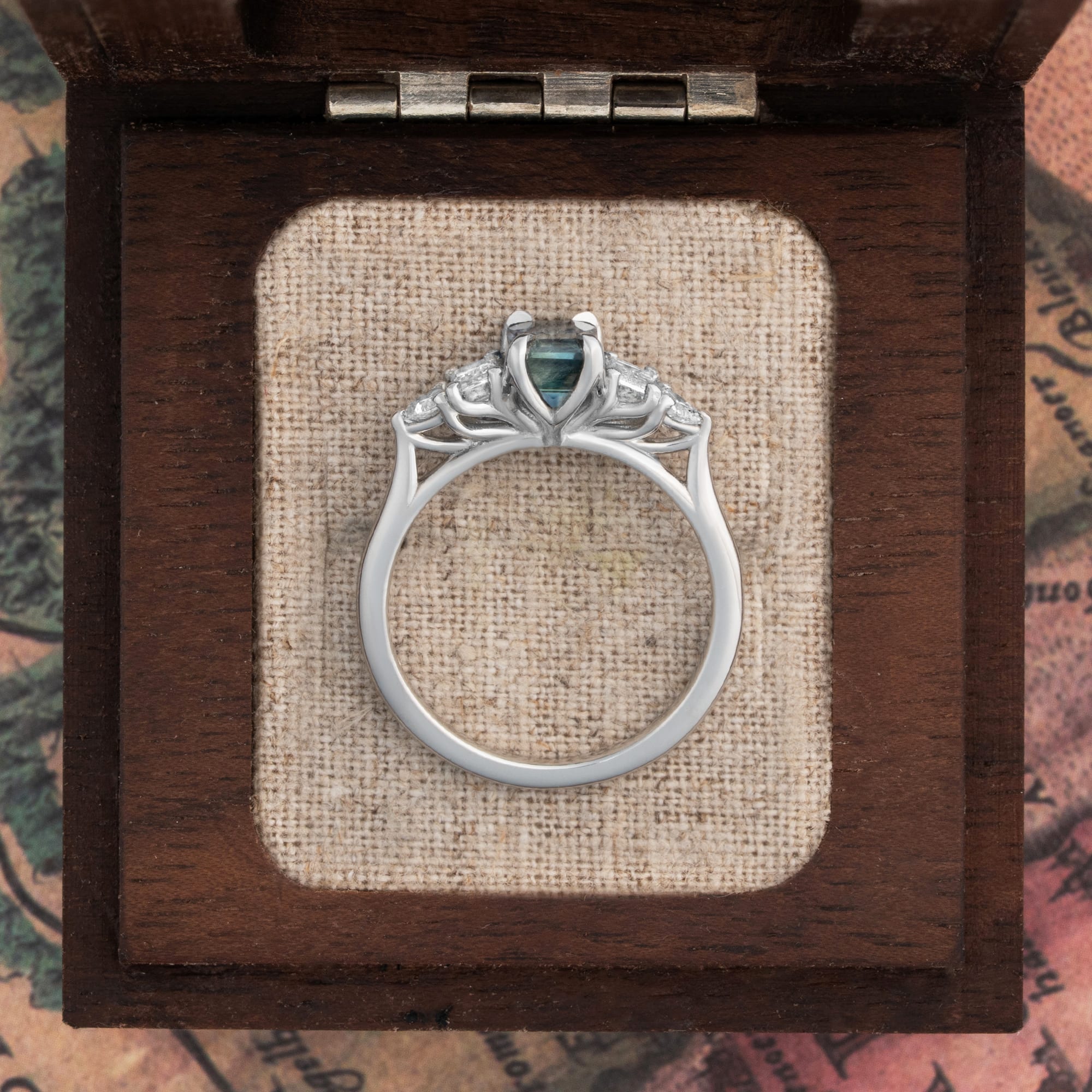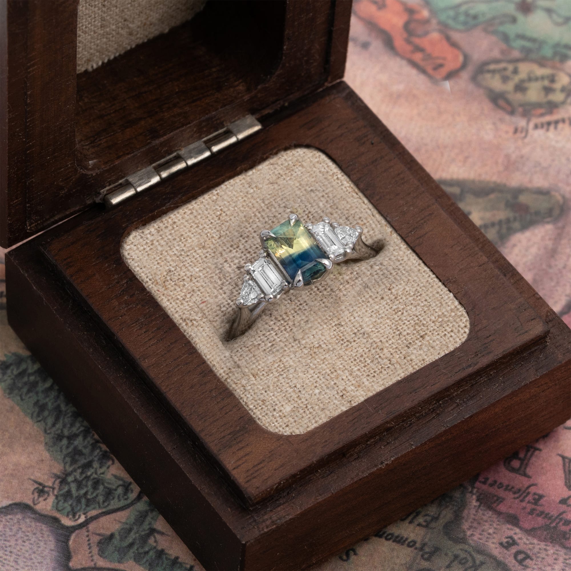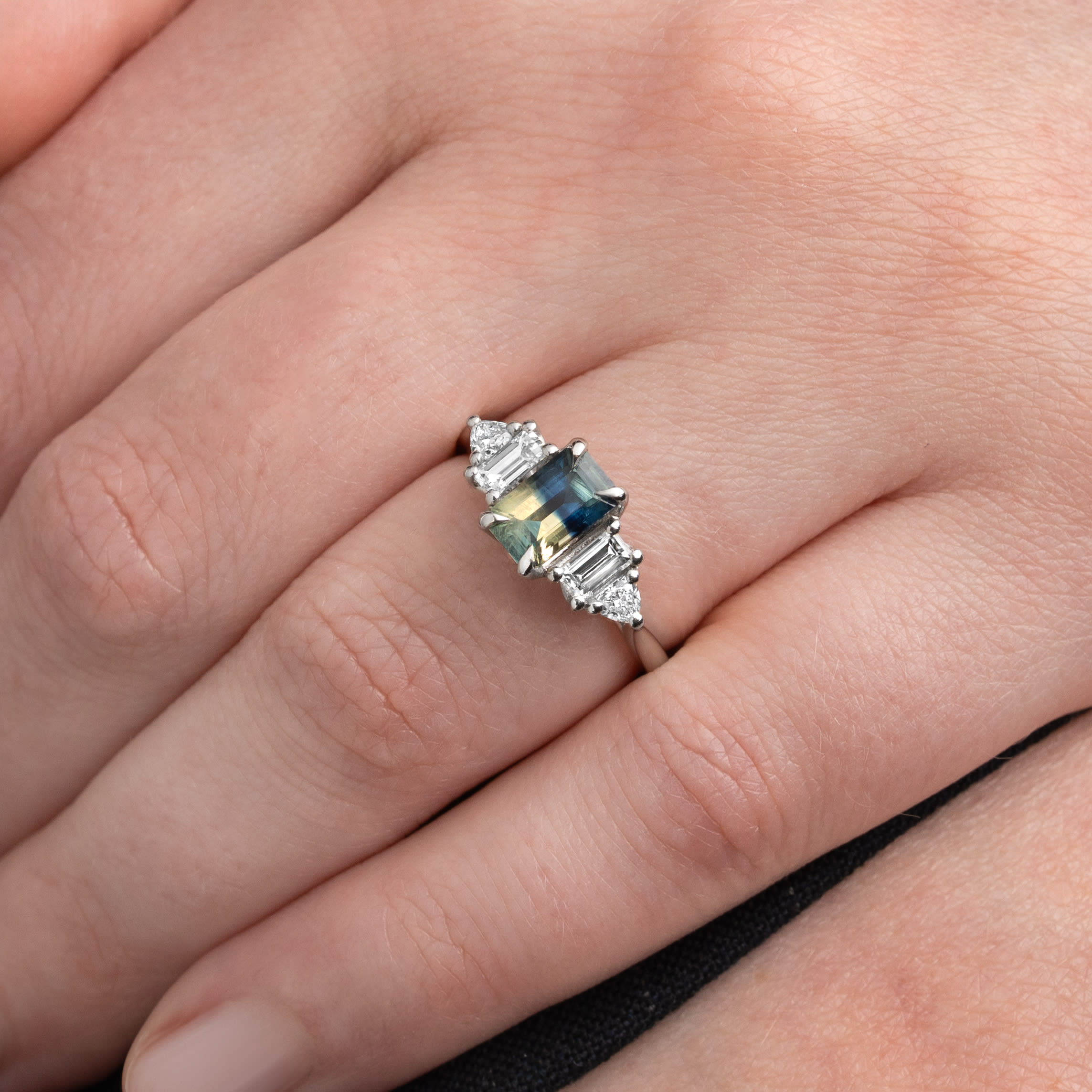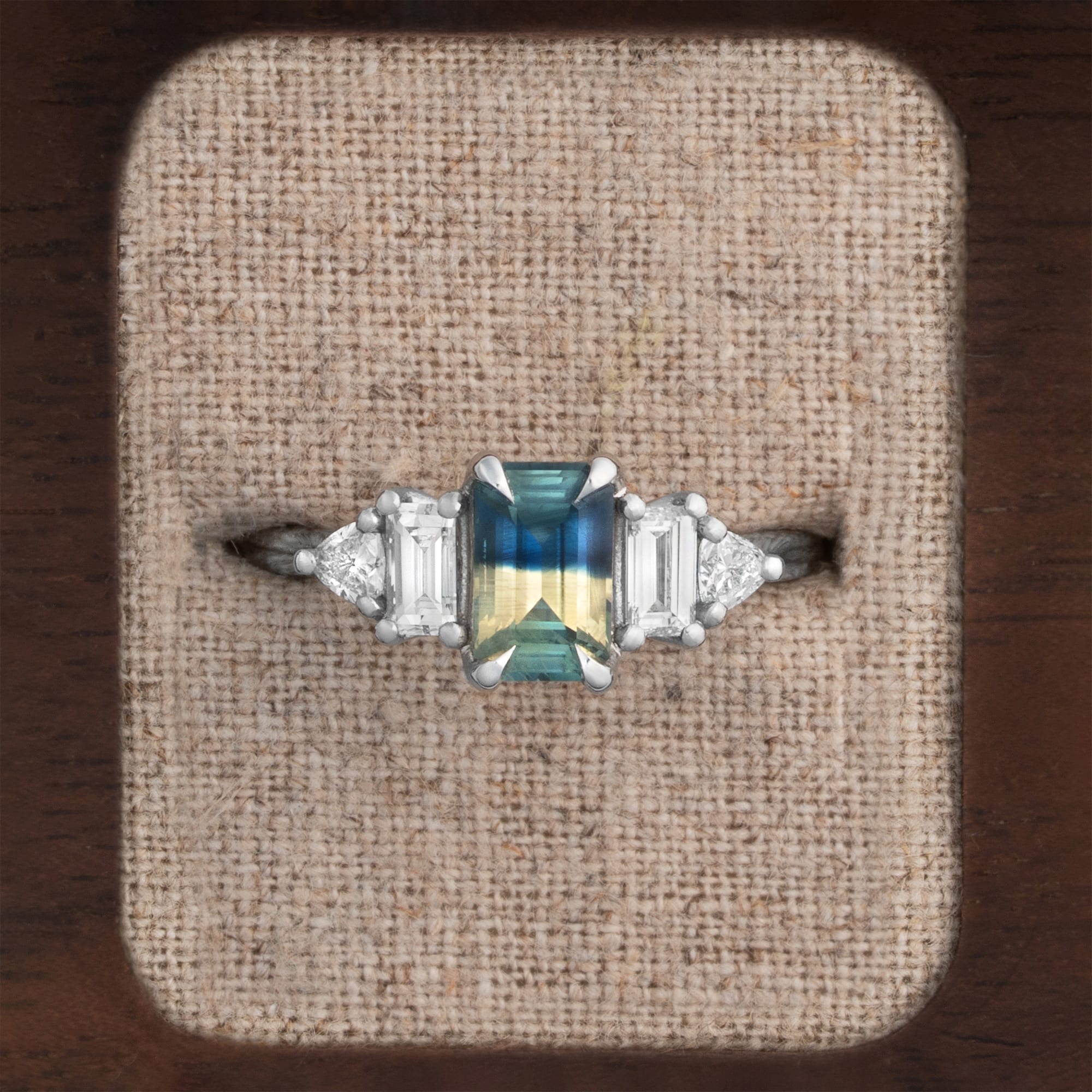Description: This Art Deco-inspired five-stone engagement ring features a central talon-set emerald cut bi colour sapphire. The center stone is flanked by lab-grown baguette and trillion-cut diamonds, creating a symmetrical design. Set in platinum, each stone is secured in a graceful tulip-style setting. This fine jewellery piece balances architectural form with detailed setting work.