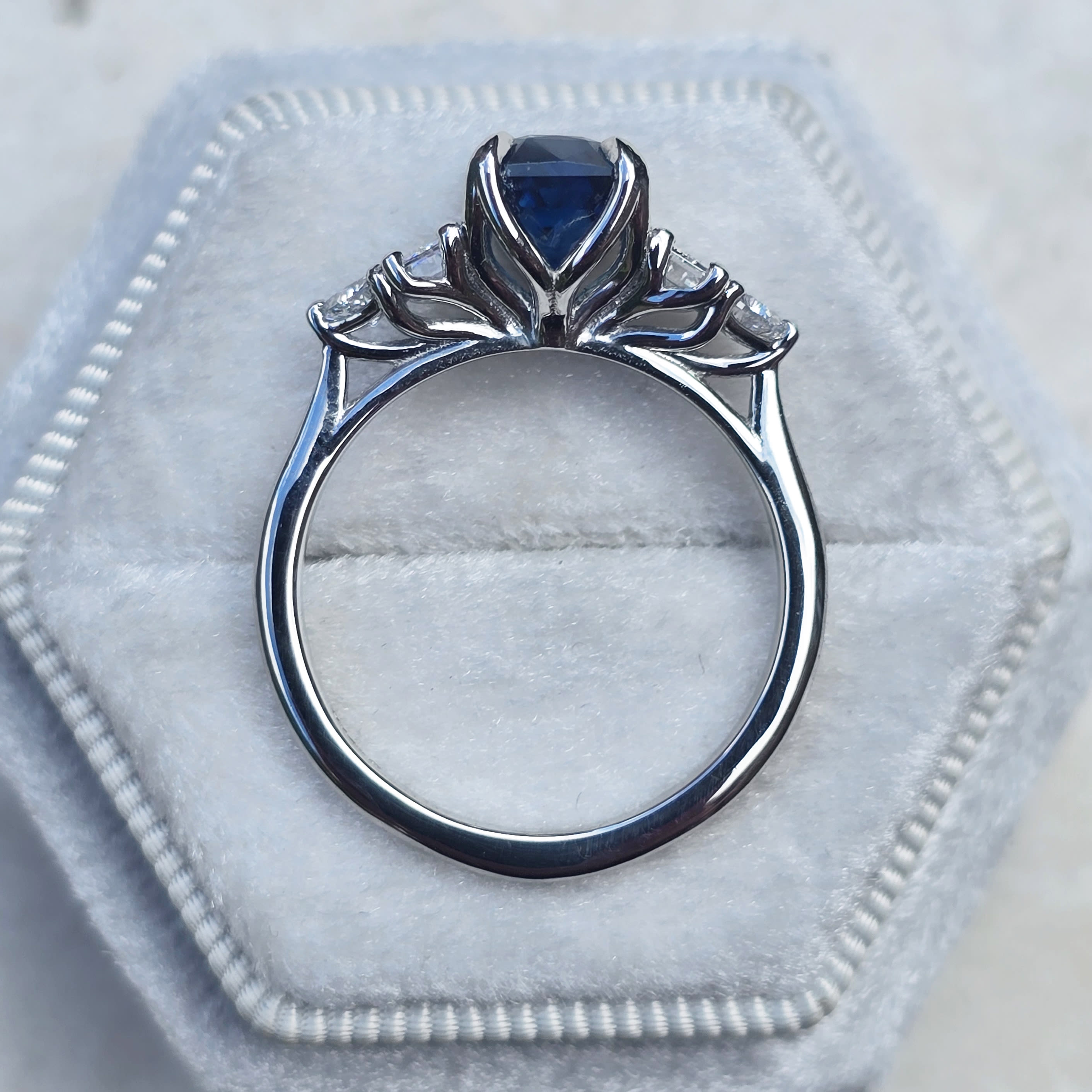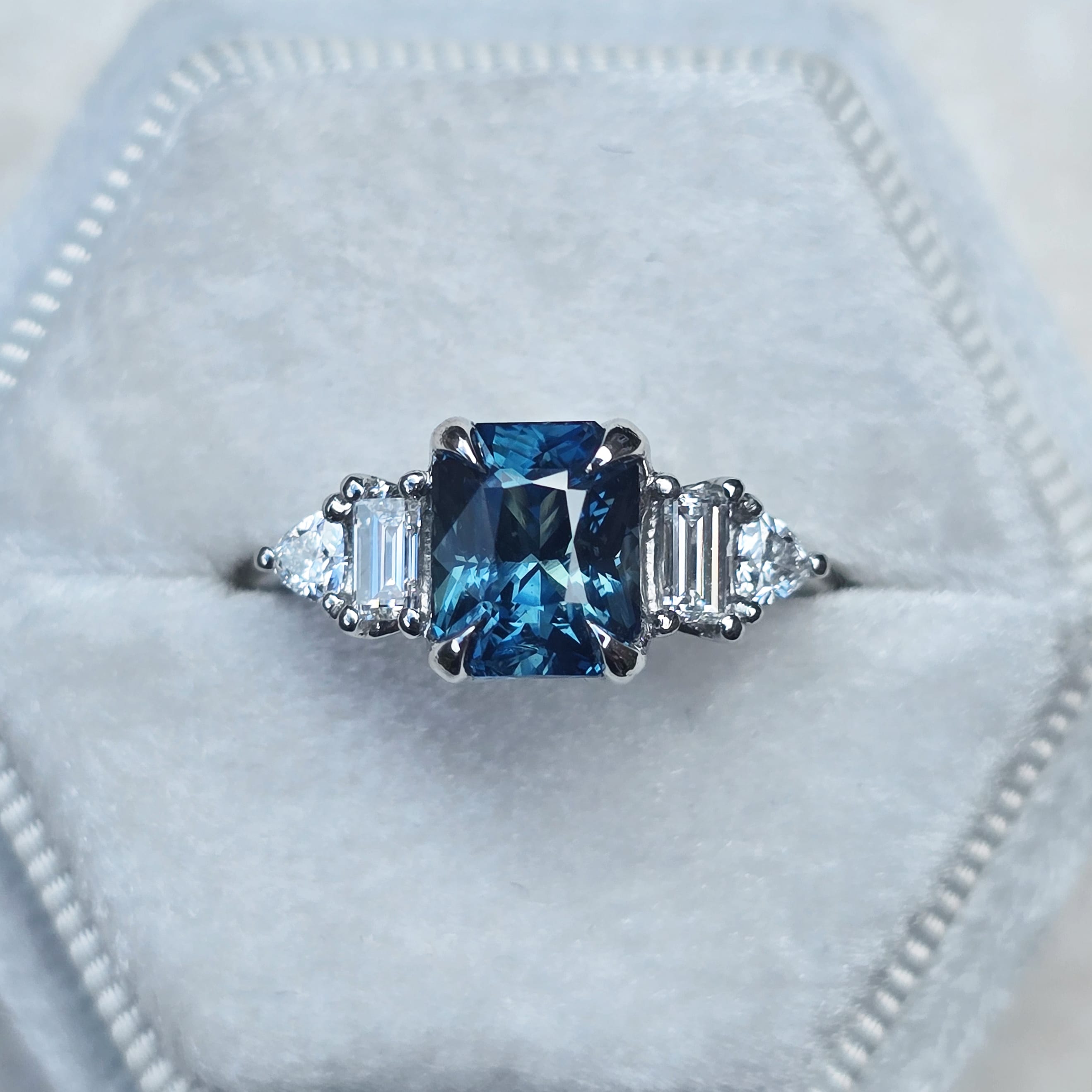 Bold geometry meets timeless elegance in this striking Art Deco-inspired five-stone ring. At its centre rests a captivating talon-set radiant-cut ocean teal sapphire. Flanked by precision-cut lab-grown diamonds— baguettes on either side and shimmering trillion cuts at each end—the ring showcases a perfect harmony of symmetry and sparkle.