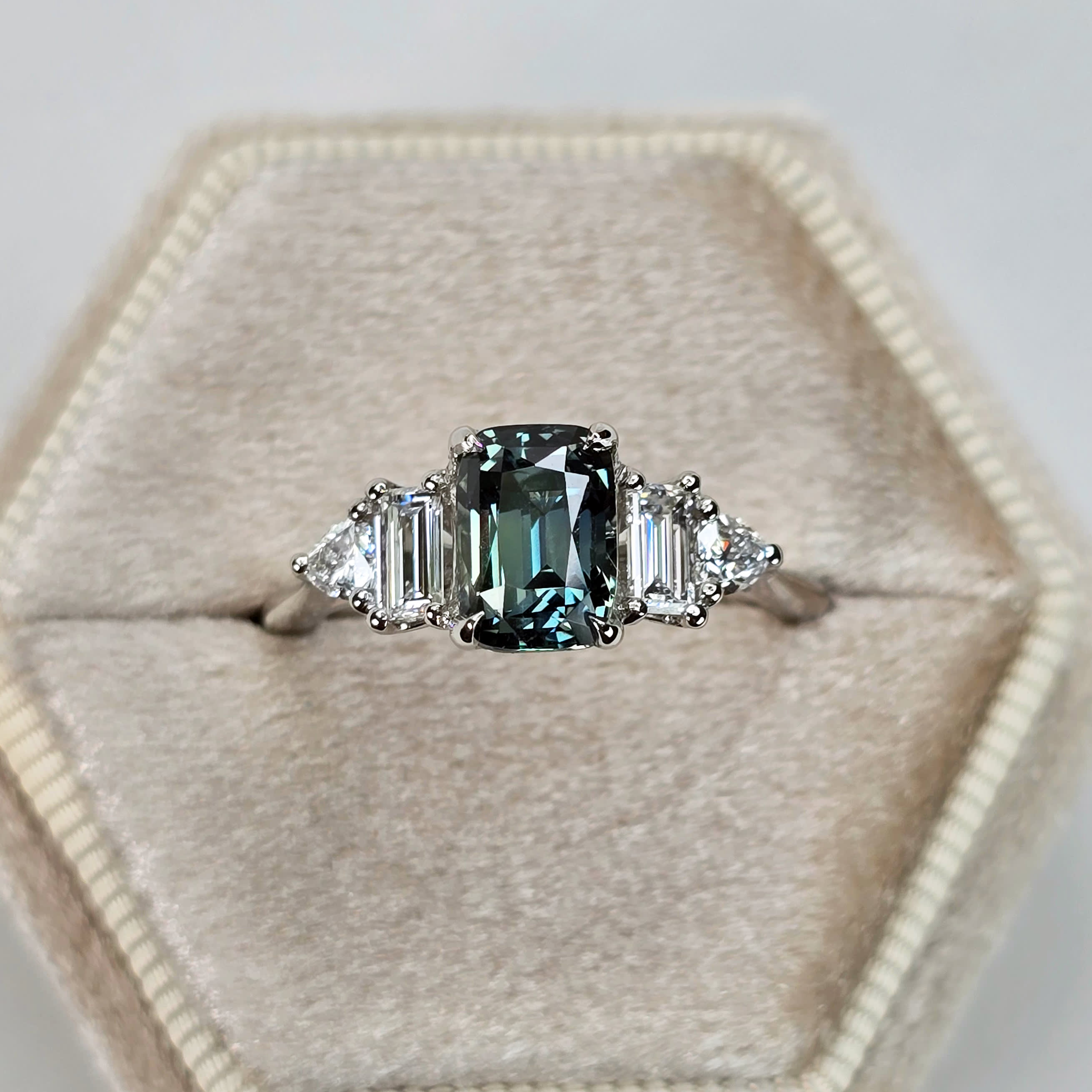 Description: This five-stone engagement ring features an Art Deco-inspired silhouette. The centre stone is a 2.19ct cushion-cut natural teal sapphire set with talon prongs in a tulip-style head. The ring is flanked by four lab-grown diamonds, including two baguette cuts and two trillion cuts, totaling 0.62ct, arranged symmetrically.