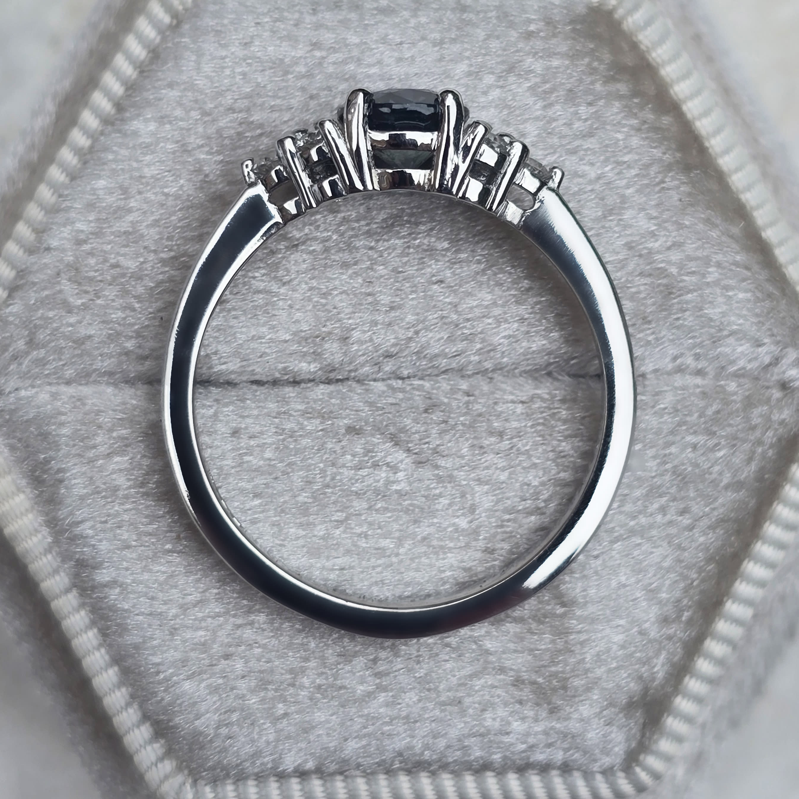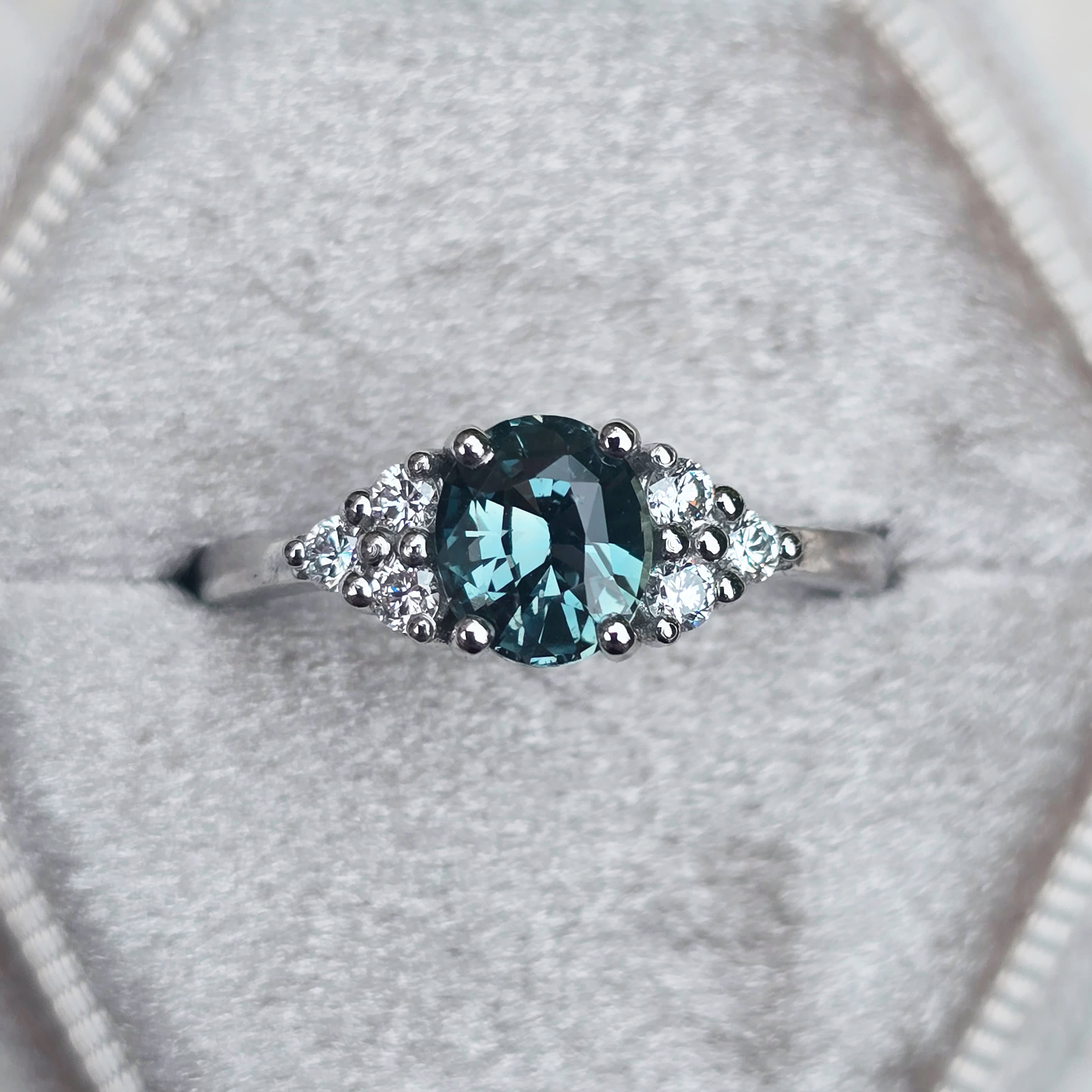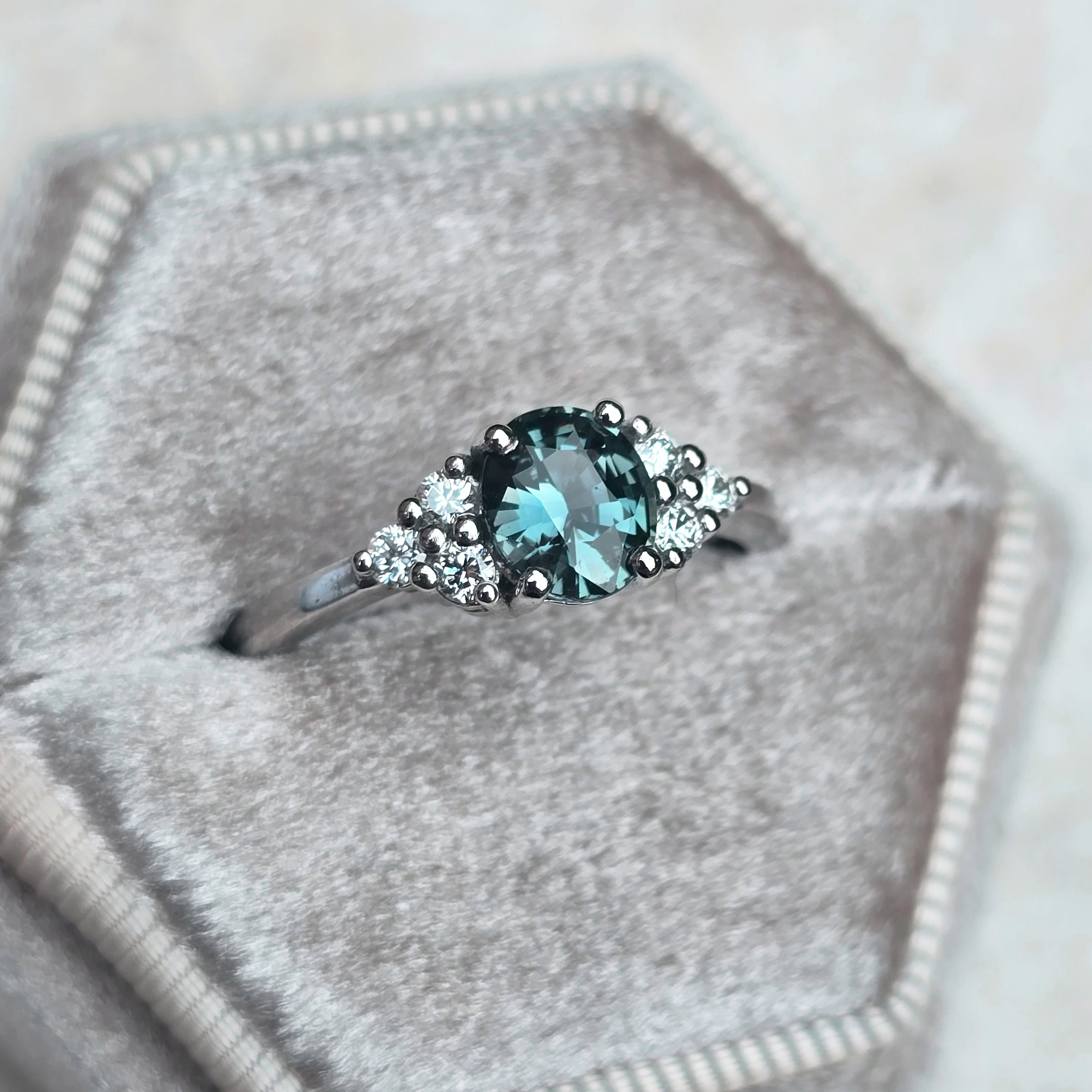 This absolutely gorgeous ring features a beautiful 1.19ct oval steely teal sapphire. The sapphire displays hues of cool green-blue with grey undertones. It is set with 6 diamonds flanking on either side in a classic 7 stone platinum mount!