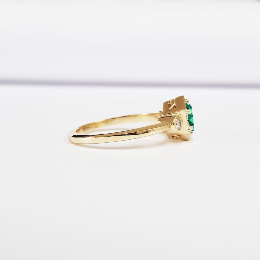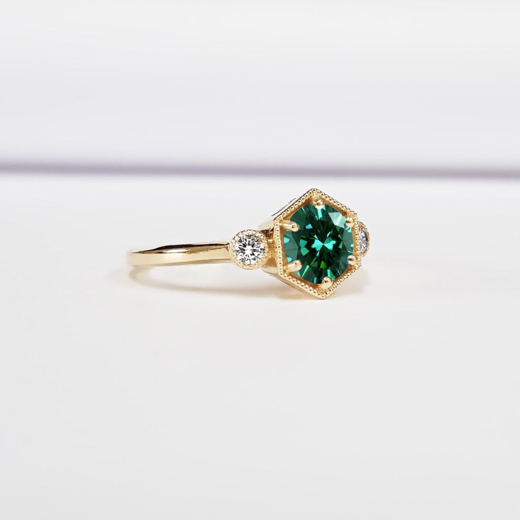 This brand new stunning ring features a central brilliant cut teal green Moissanite, that has been claw set with two smaller brilliant cut moissanites, in a art deco inspired, hexagon milgrain setting.
