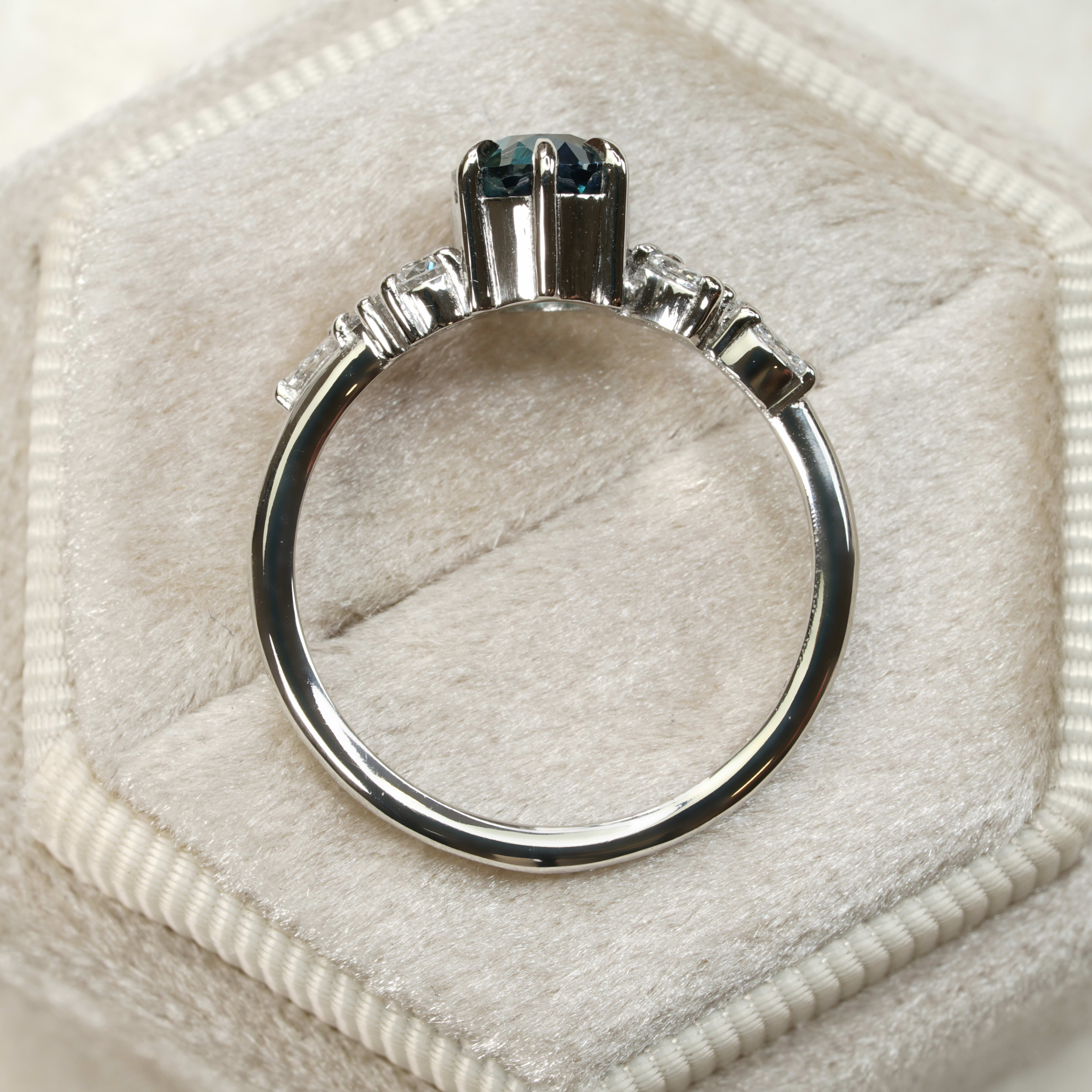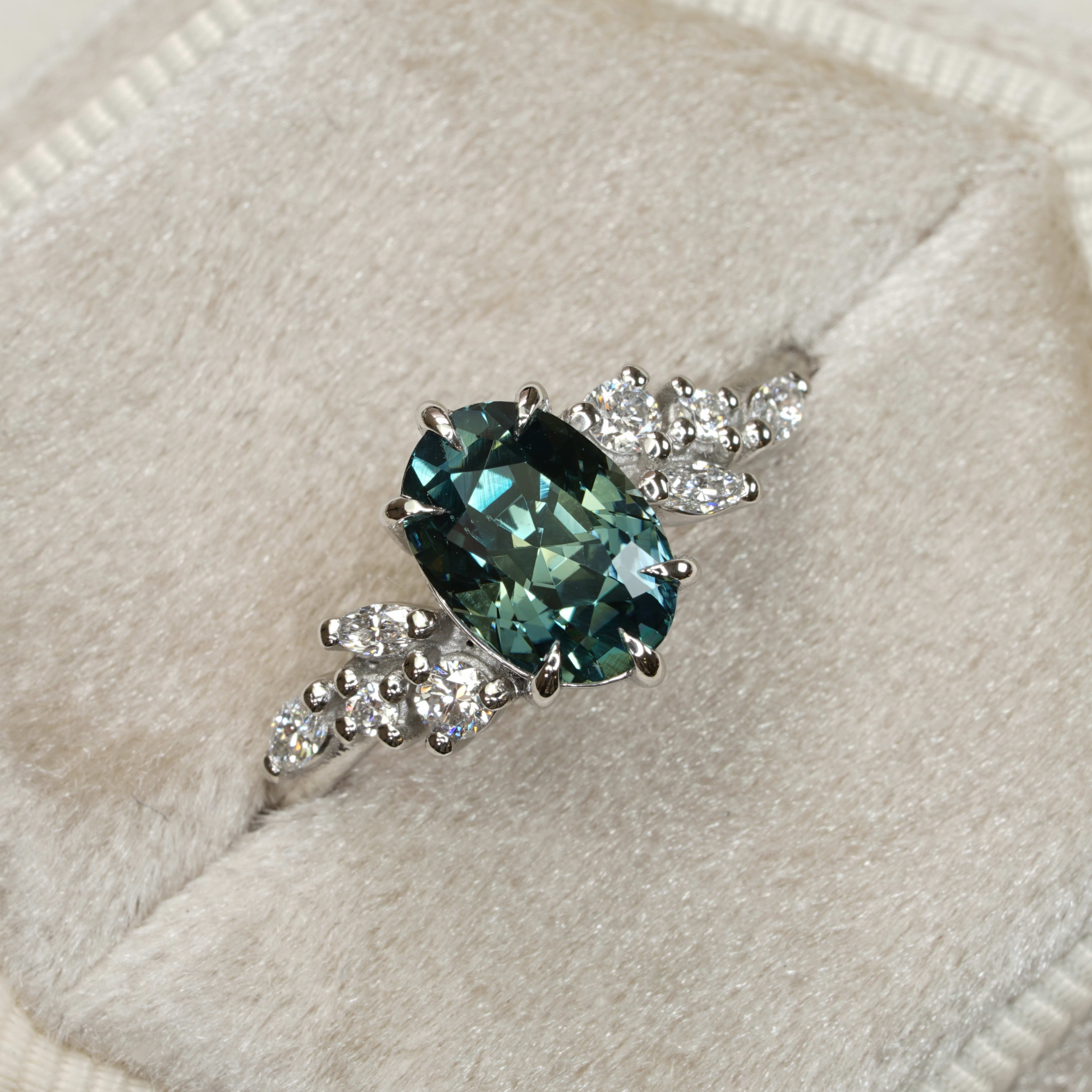 This brand new ring features a stunning oval cut, 2.18ct, natural, unheated teal sapphire. The sapphire has been set with a mixture of marquise and round cut lab grown diamonds in a flowing, floral inspired pattern!