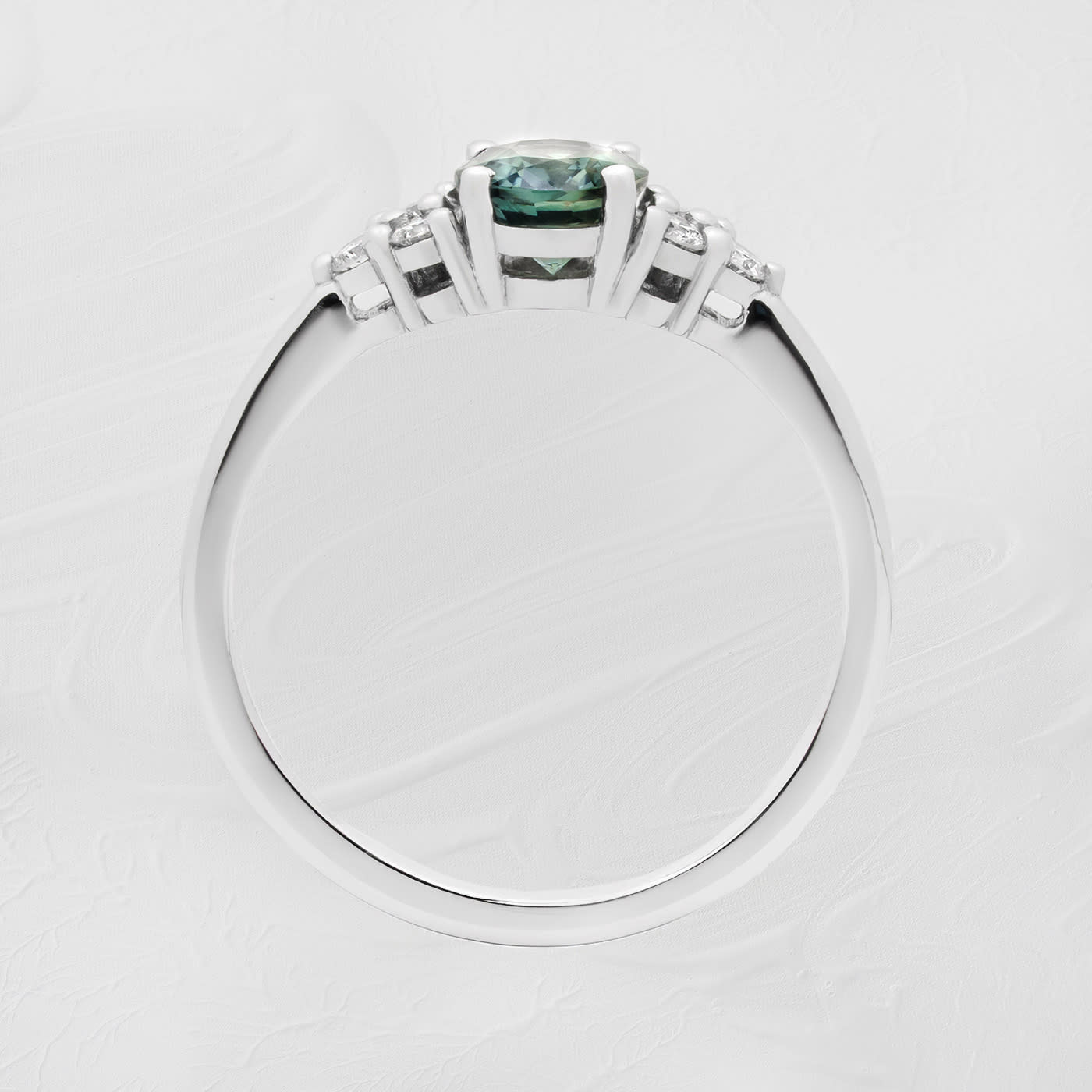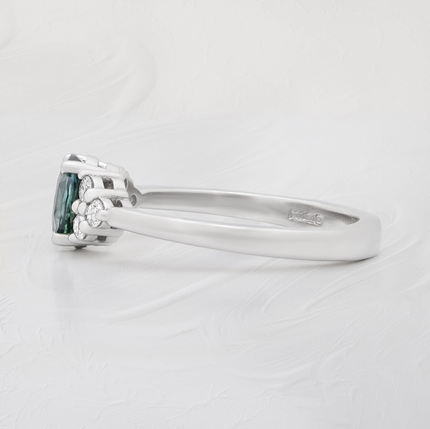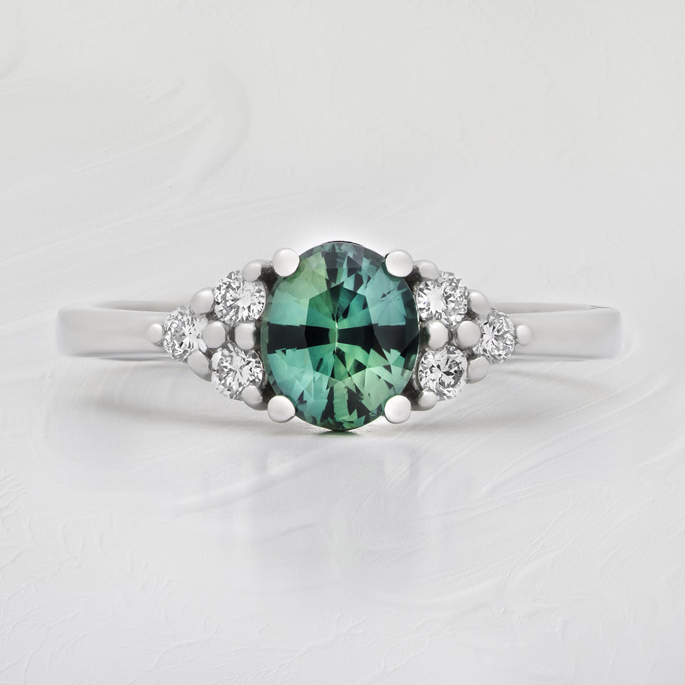 This absolutely gorgeous ring features a beautiful 1.13ct oval teal sapphire. It is set with 6 diamonds flanking on either side in a classic 7 stone platinum mount!