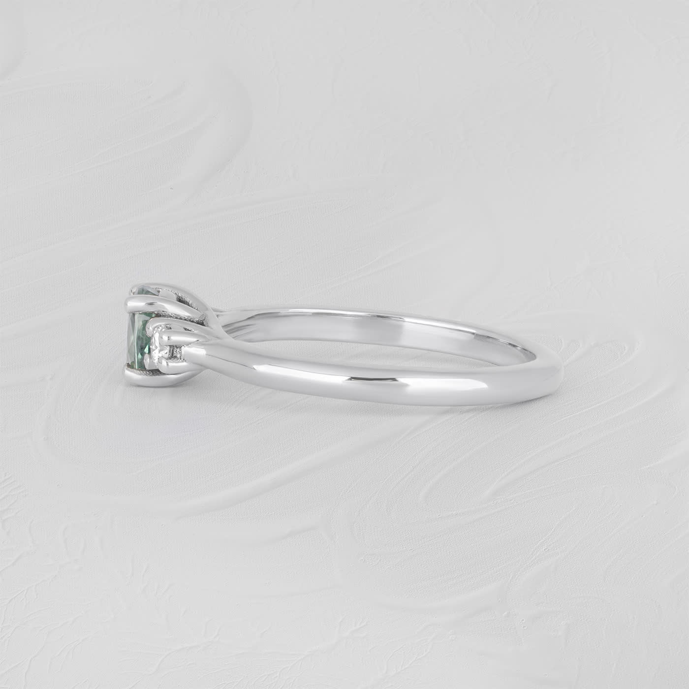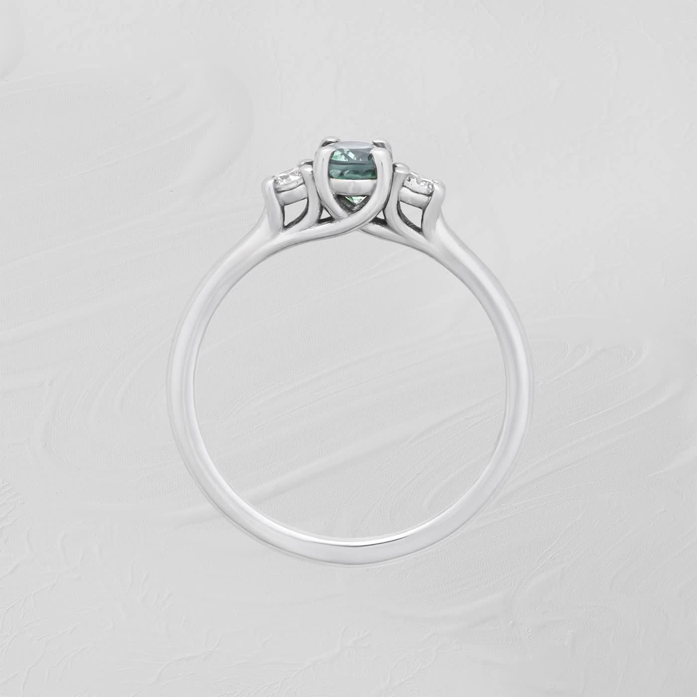 This brand new stunning ring features a central oval cut natural teal sapphire, that has been prong set with two lab grown diamonds, in a sleek and elegant trellis style mount.
