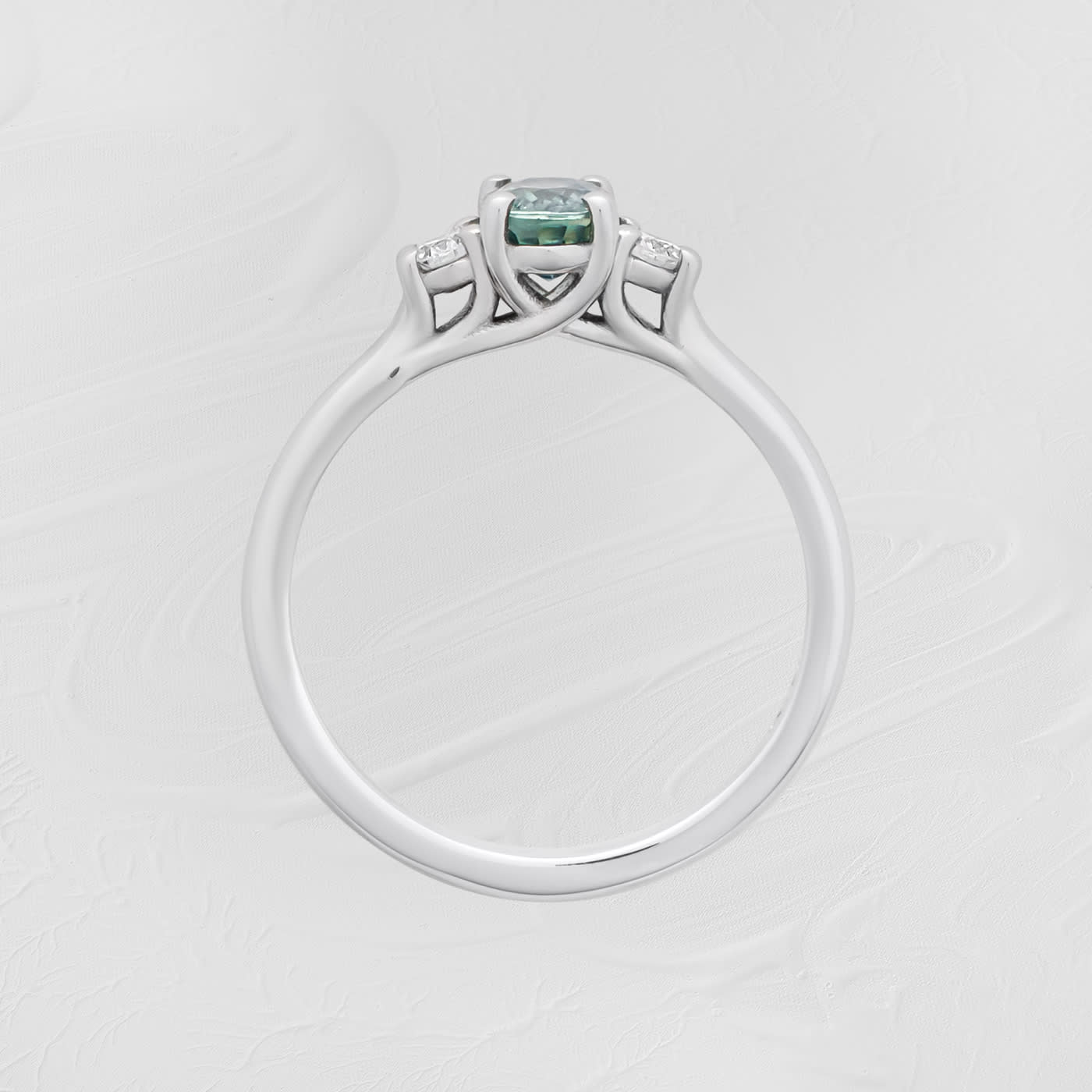 This brand new stunning ring features a central oval cut natural teal sapphire, that has been prong set with two lab grown diamonds, in a sleek and elegant trellis style mount.