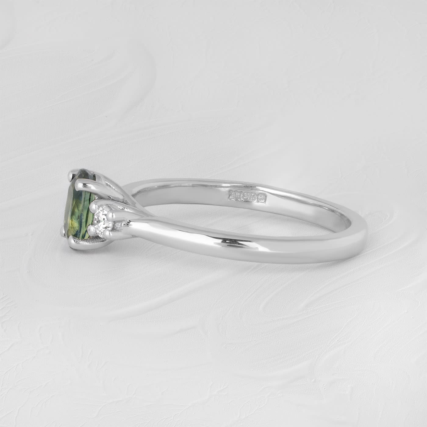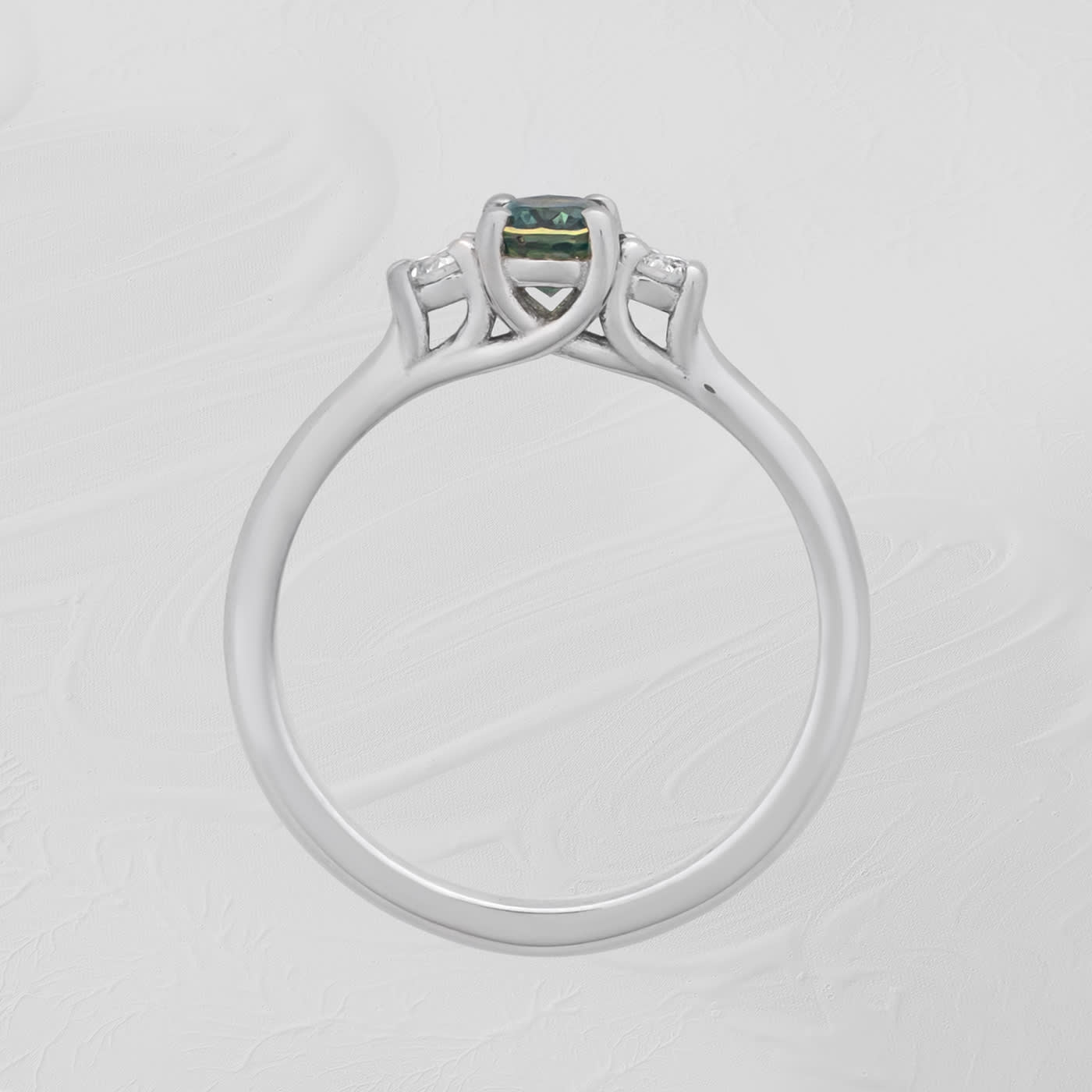 This brand new stunning ring features a central oval cut teal sapphire, that has been prong set with two lab grown diamonds, in a sleek and elegant trellis style mount.