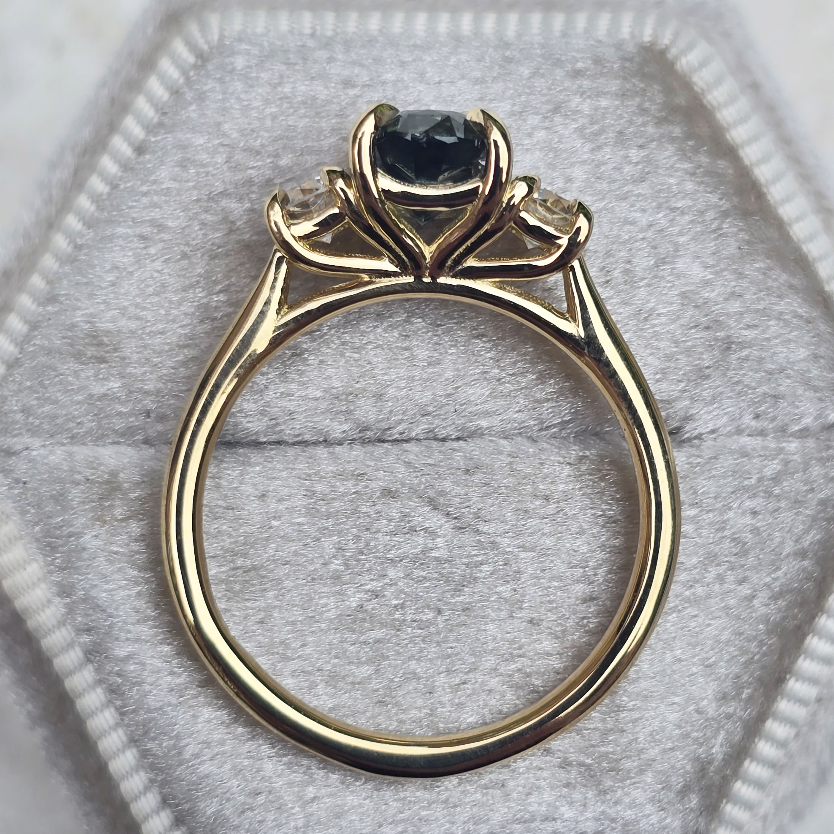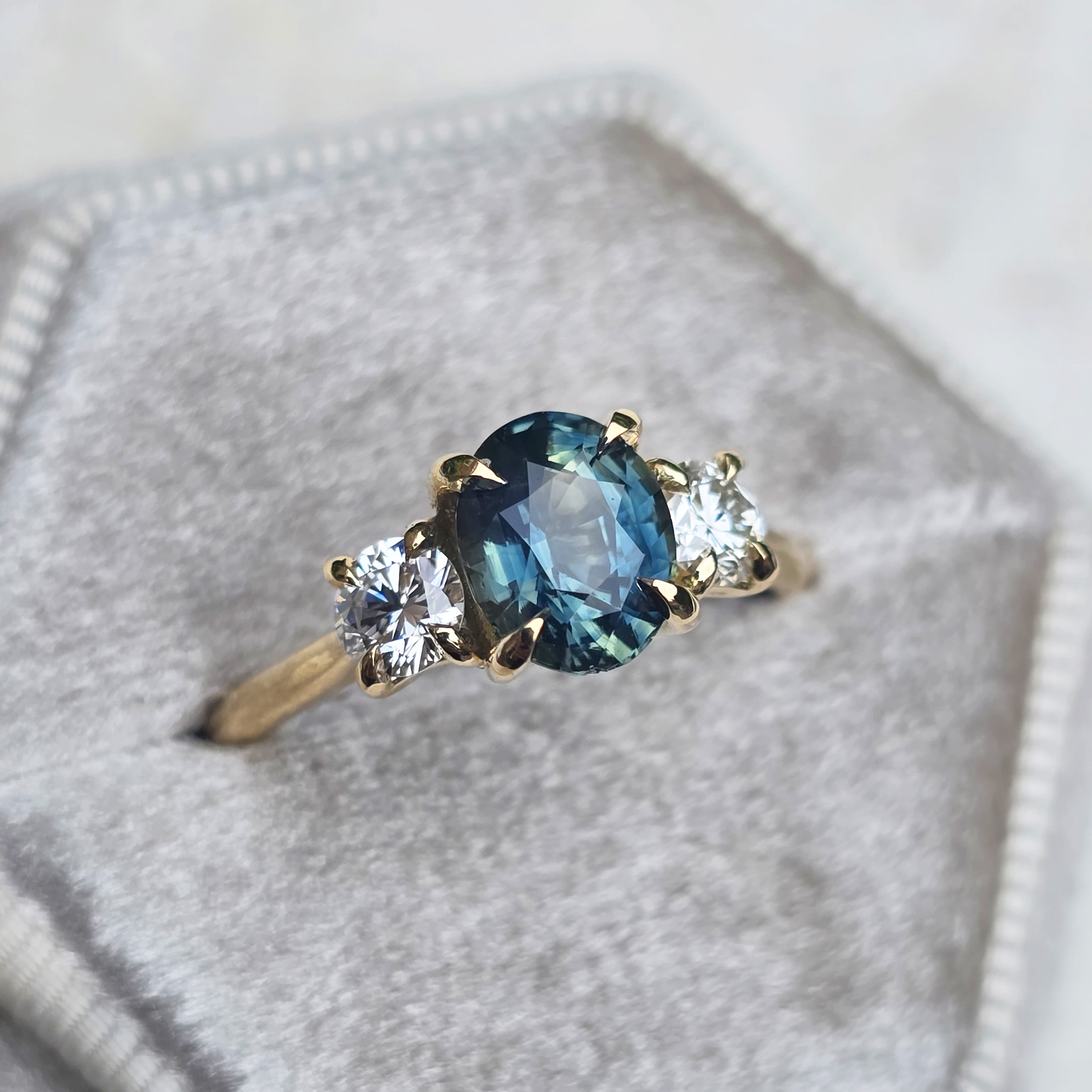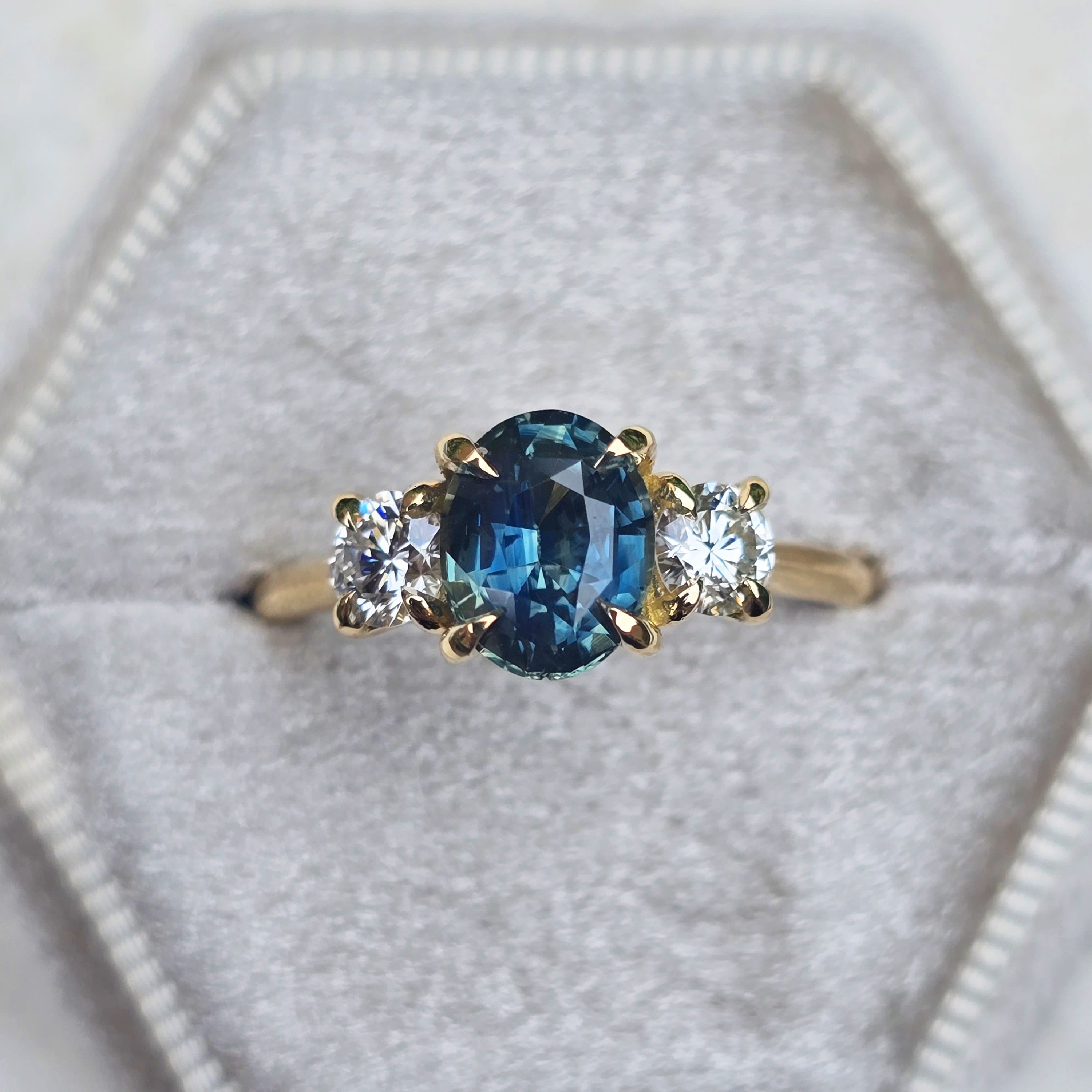 This spectacular new ring features a natural, unheated, oval cut teal sapphire, in a 4 talon setting. It is flanked by two round brilliant cut lab grown diamonds, all set in a beautifully intricate 18ct yellow gold mount.