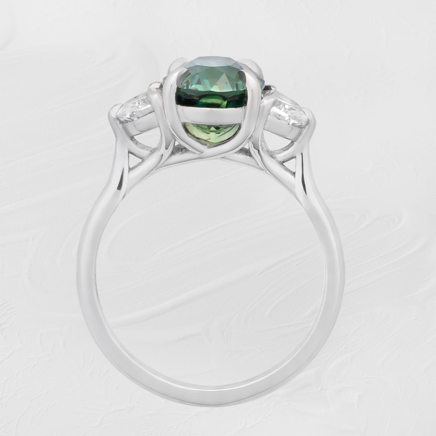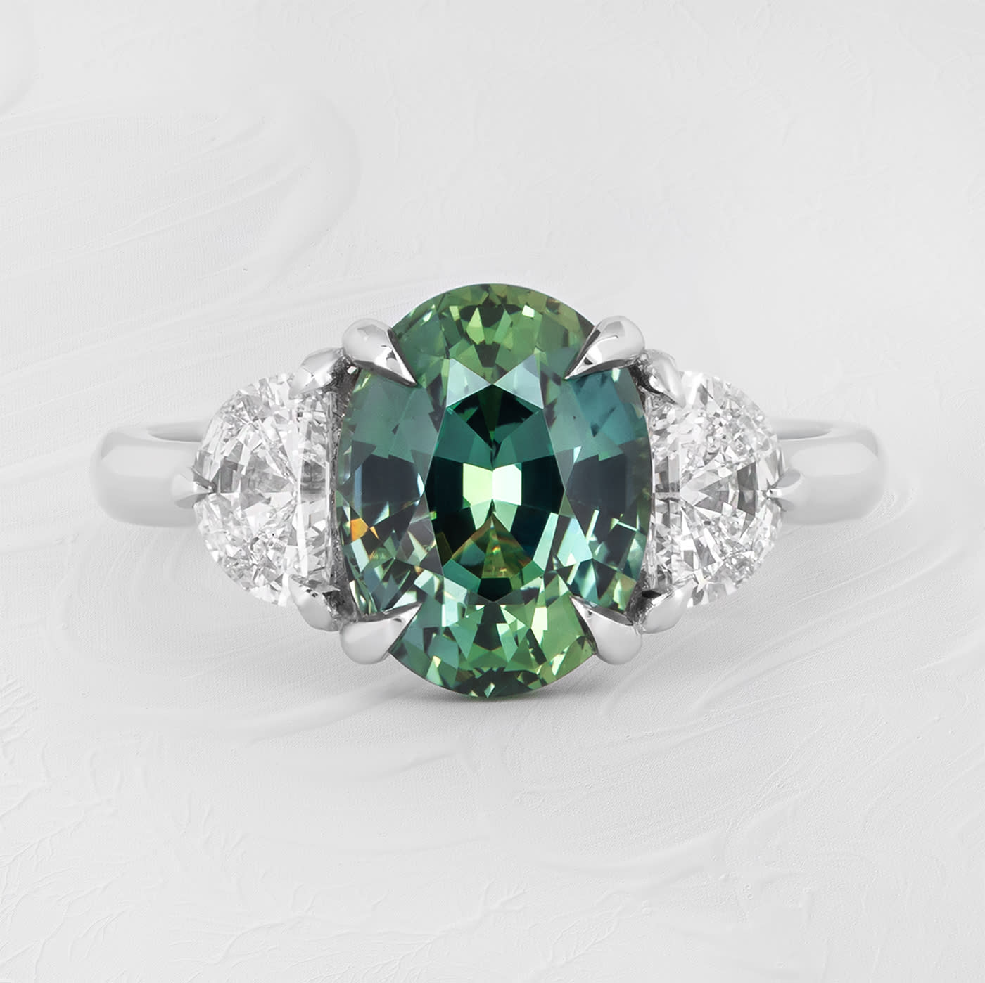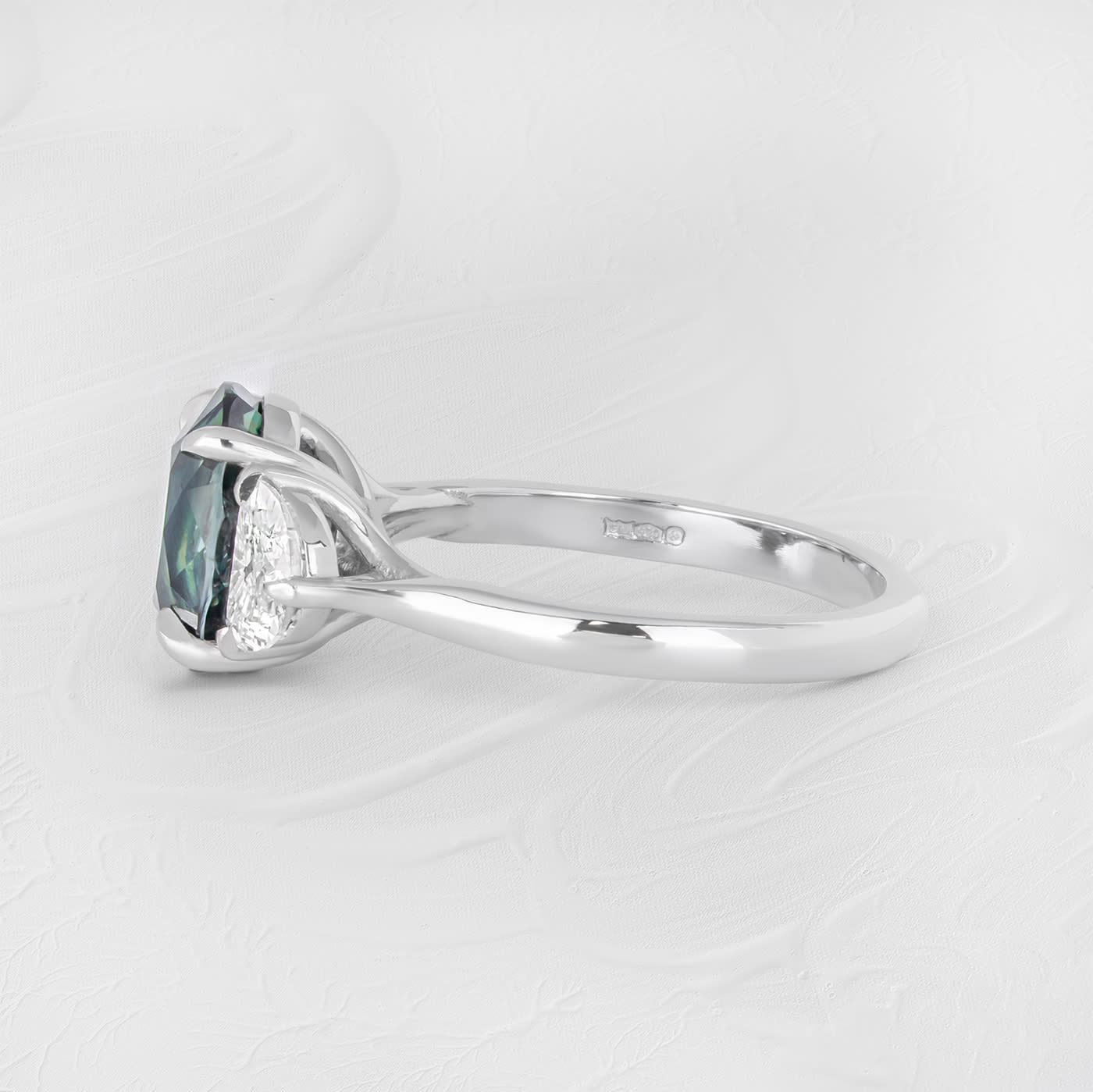 This brand new stunning ring features a central oval cut natural teal sapphire, that has been prong set with two half moon lab grown diamonds, in a sleek and elegant trellis style mount.