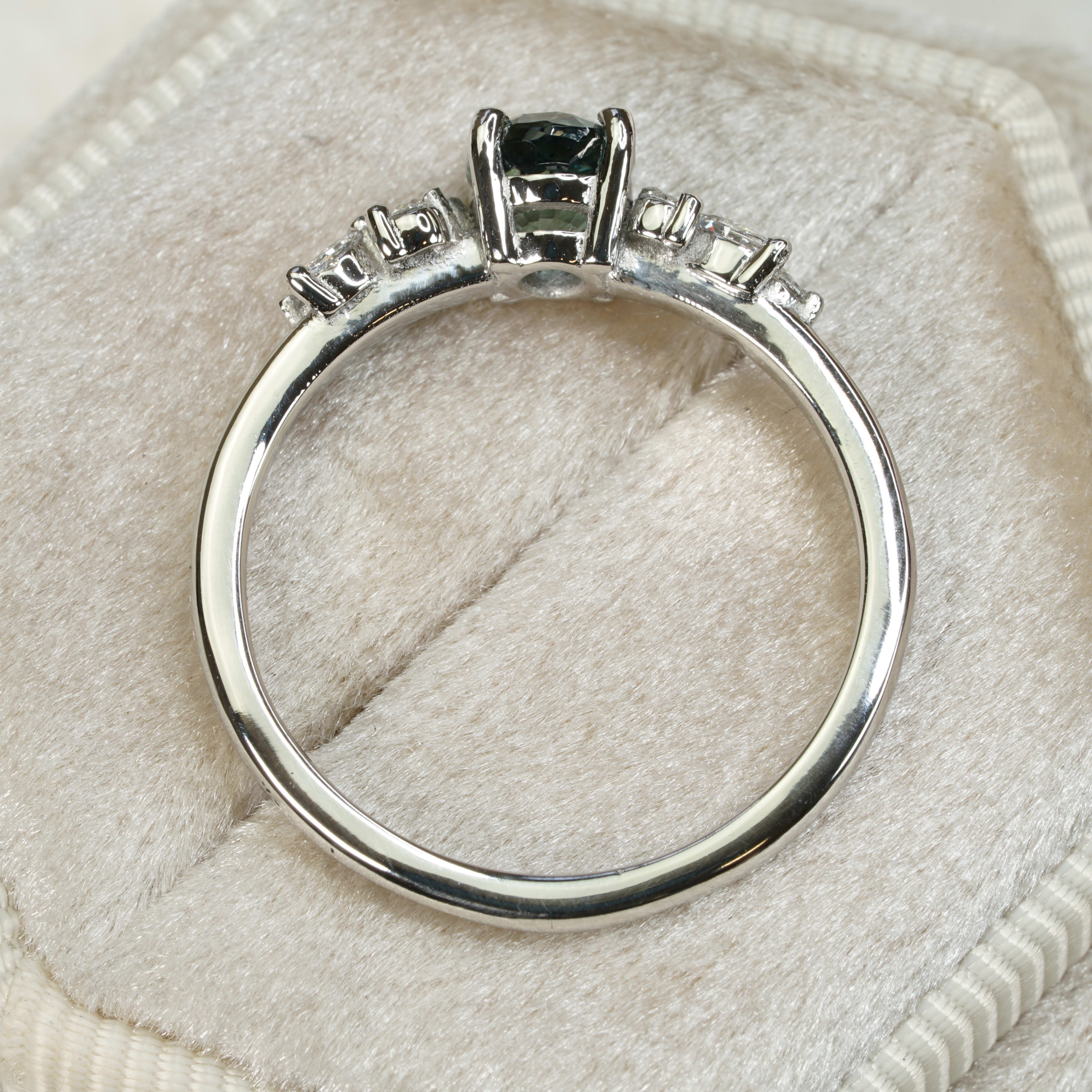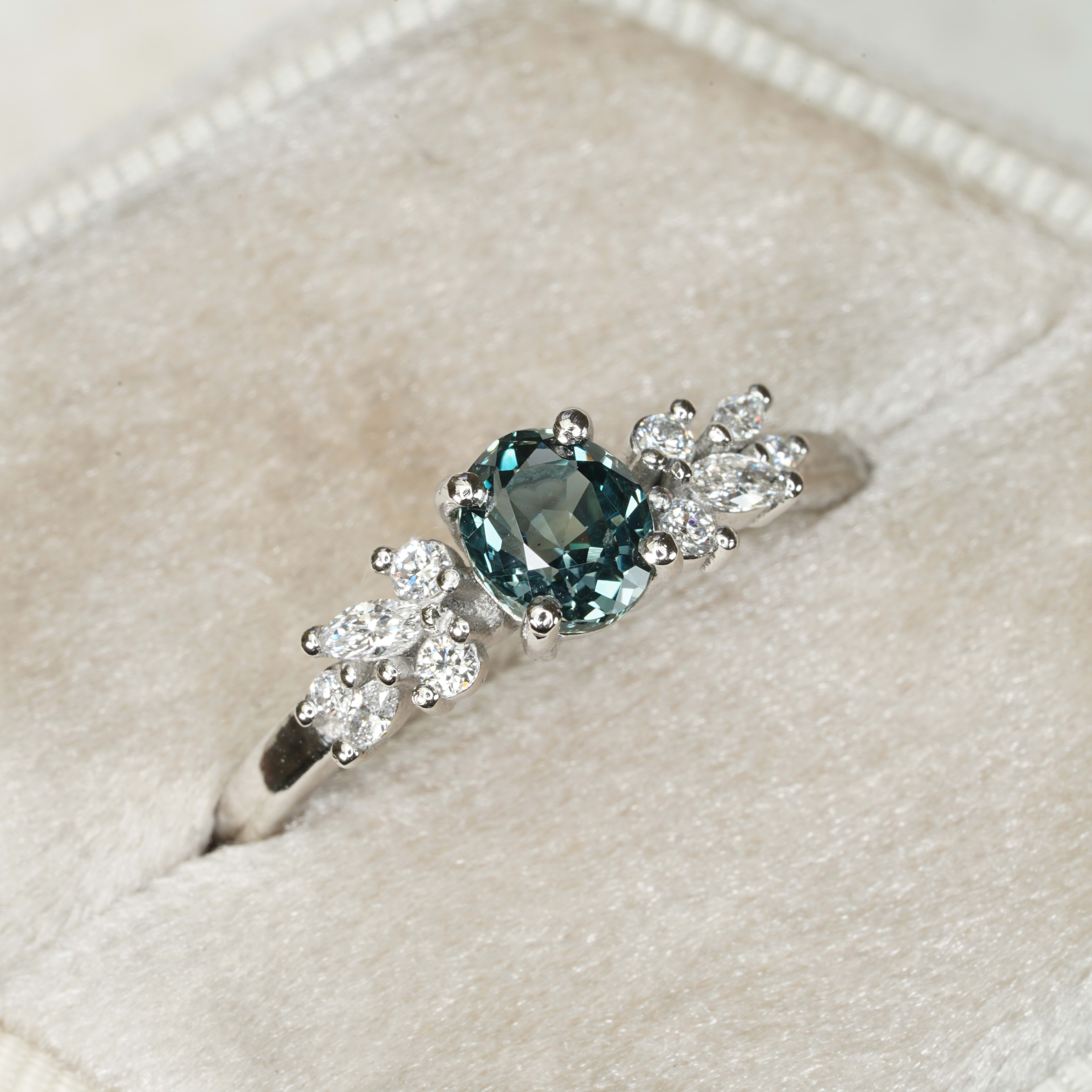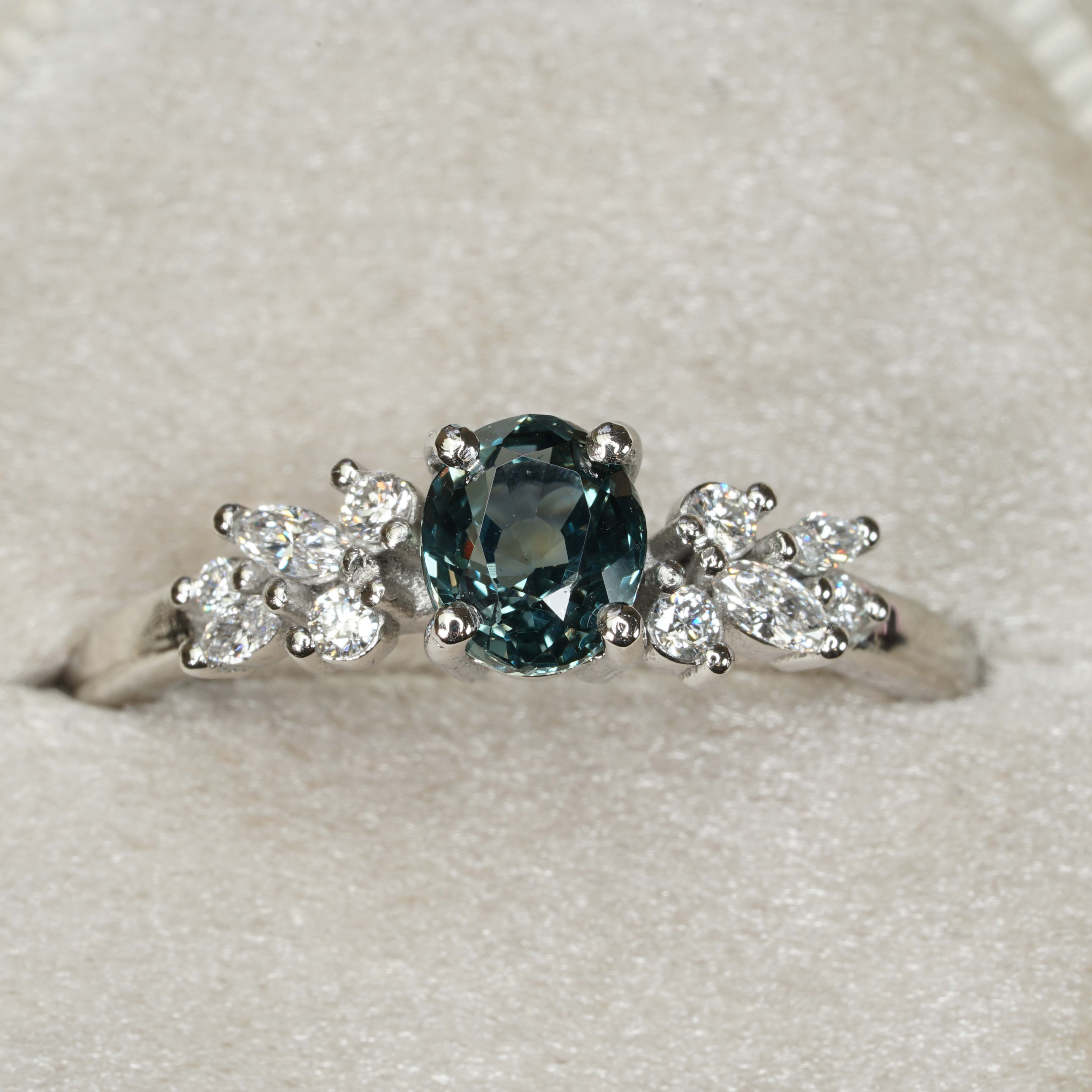 This brand new stunning ring features a central natural 0.98ct oval cut teal sapphire, that has been prong set with a floral arrangement of marquise and round brilliant cut diamonds, in a low profile platinum mount!