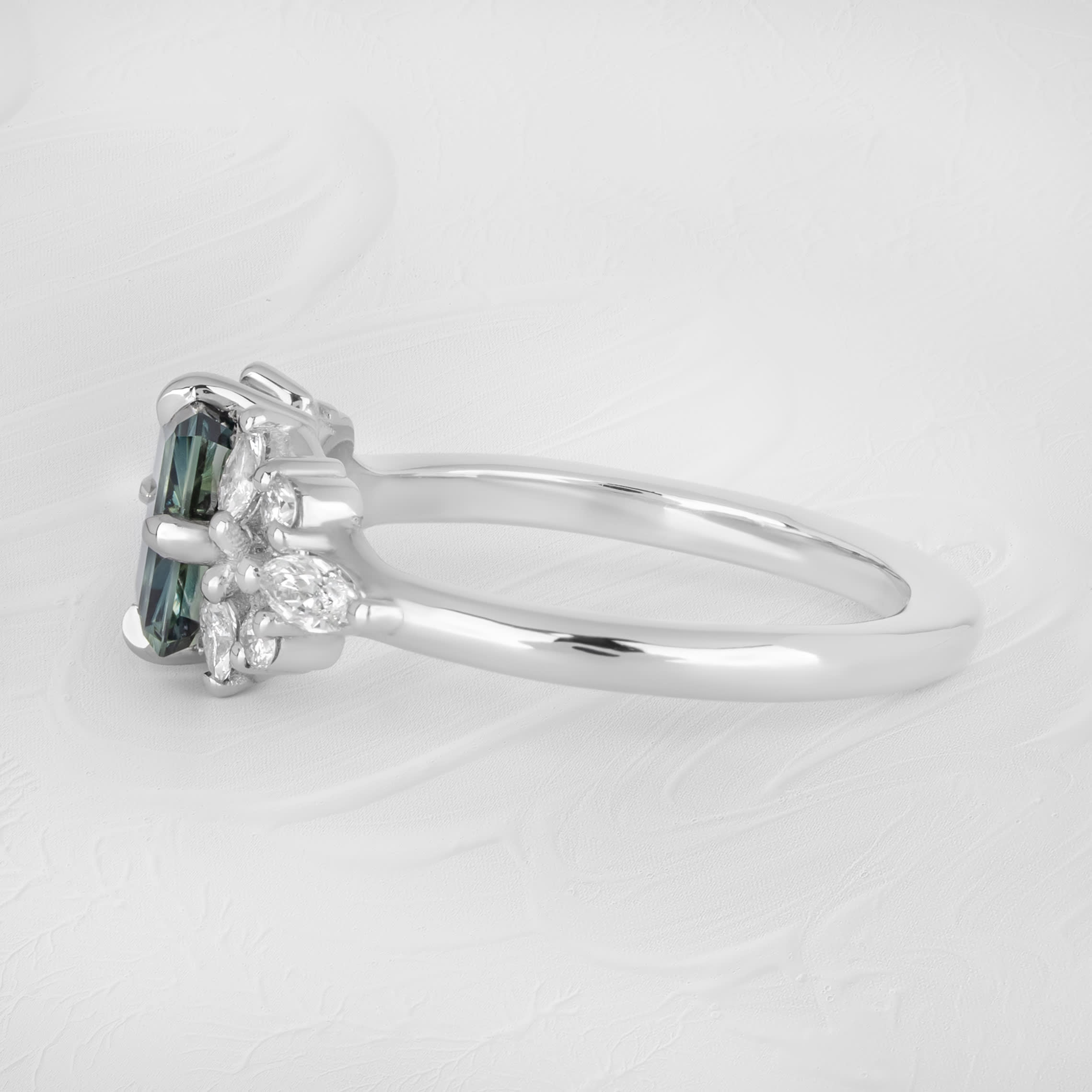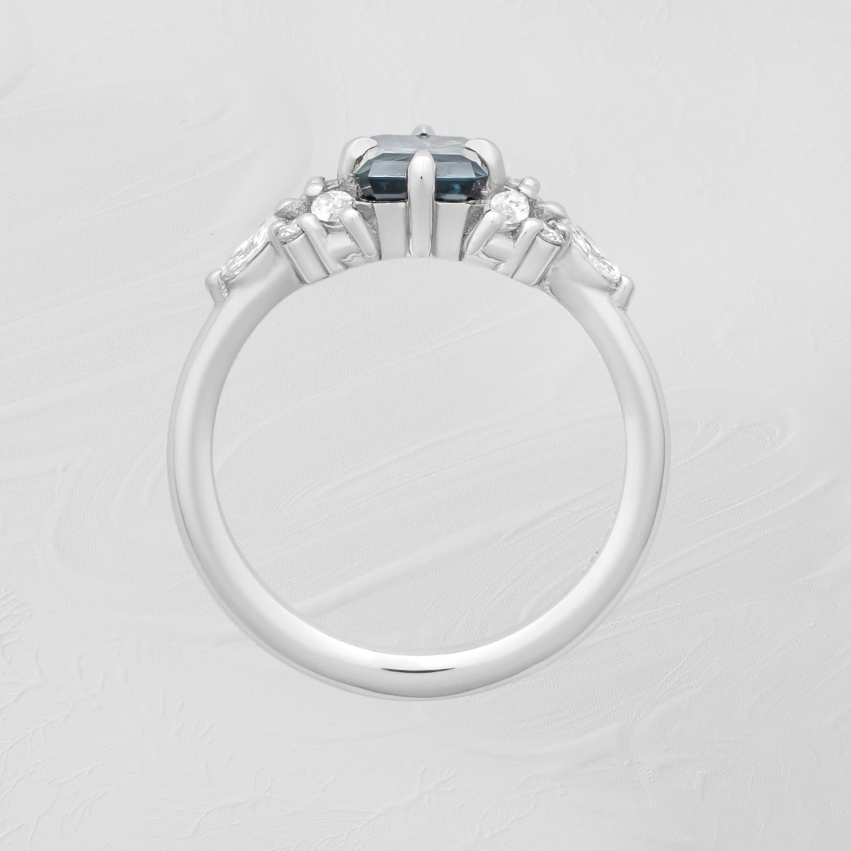 Framing this unique centrepiece, marquise and round brilliant lab grown diamonds are delicately arranged in a floral-inspired design, evoking the timeless beauty of nature. The setting, crafted in platinum, contrasts the sapphire’s rich tones while adding a touch of vintage elegance.
