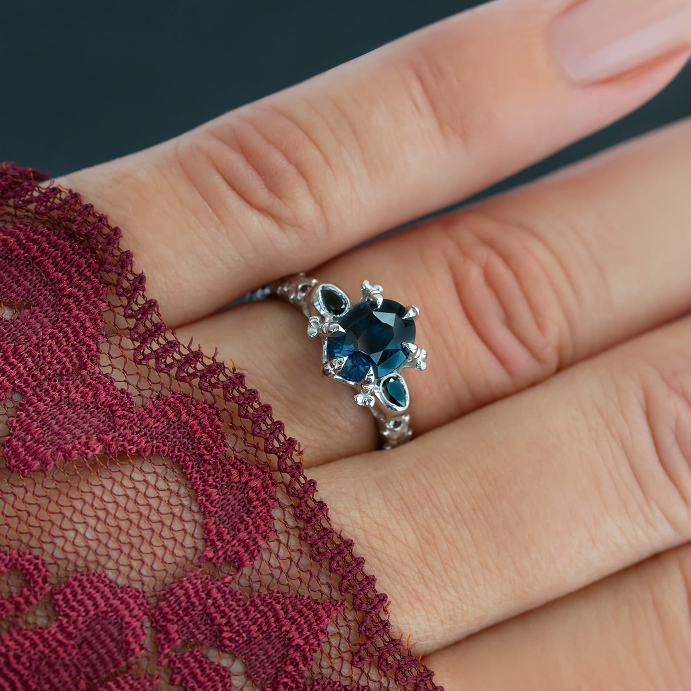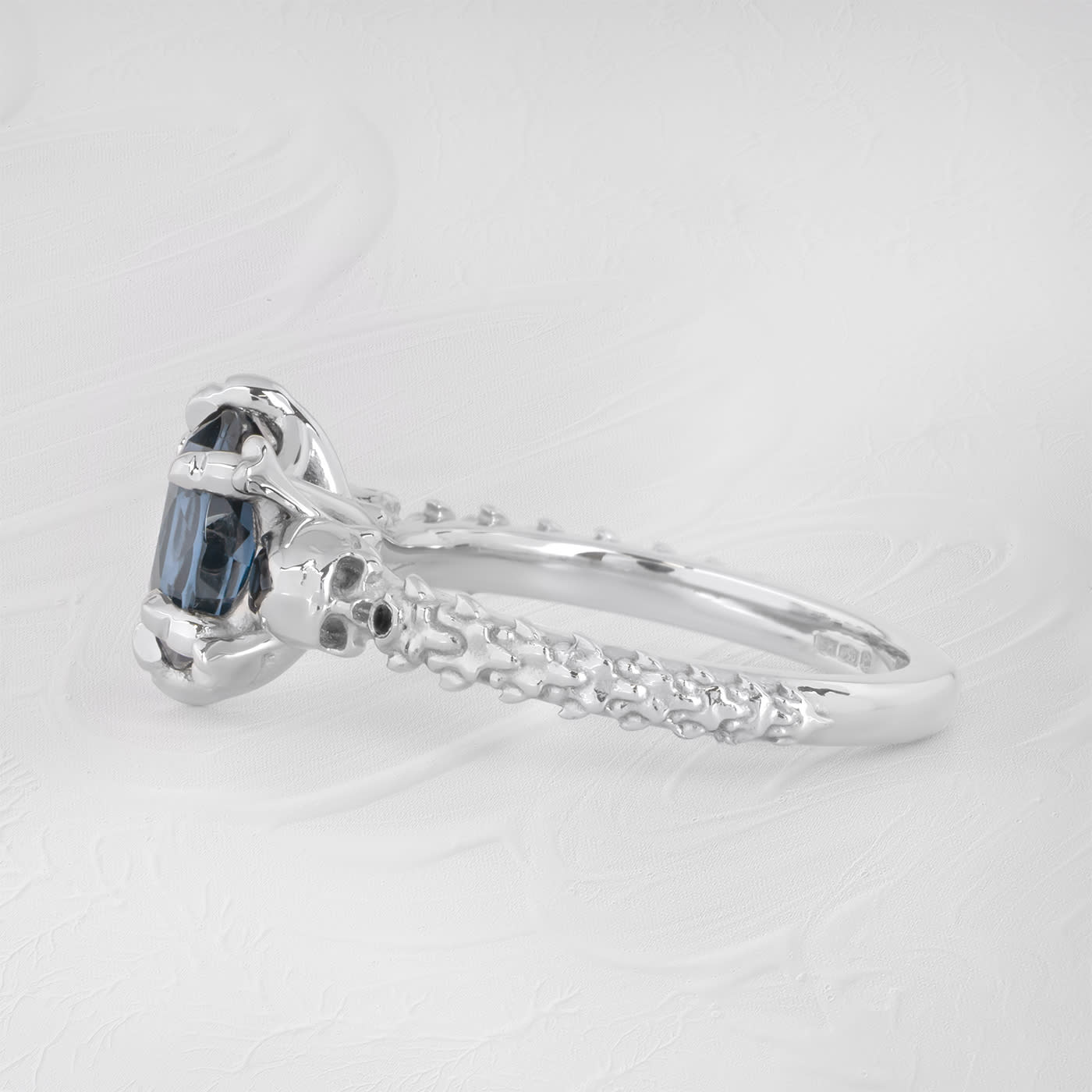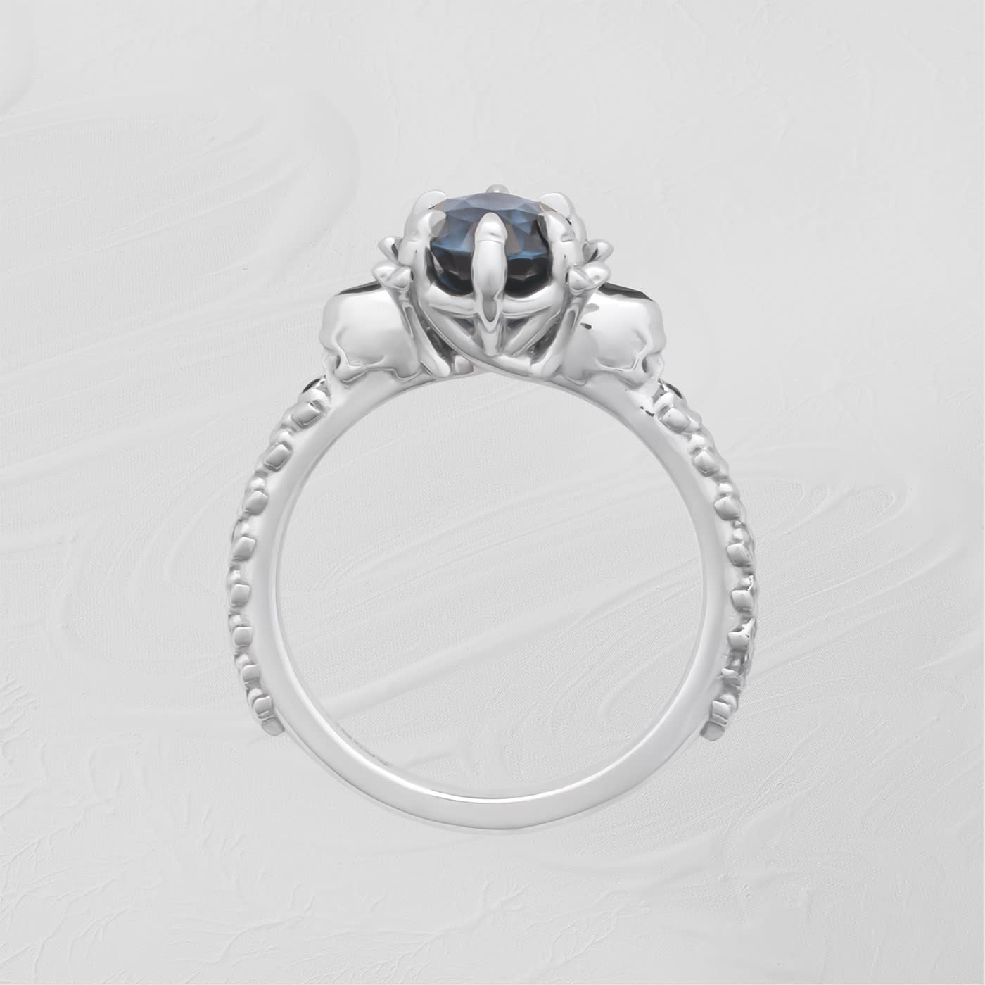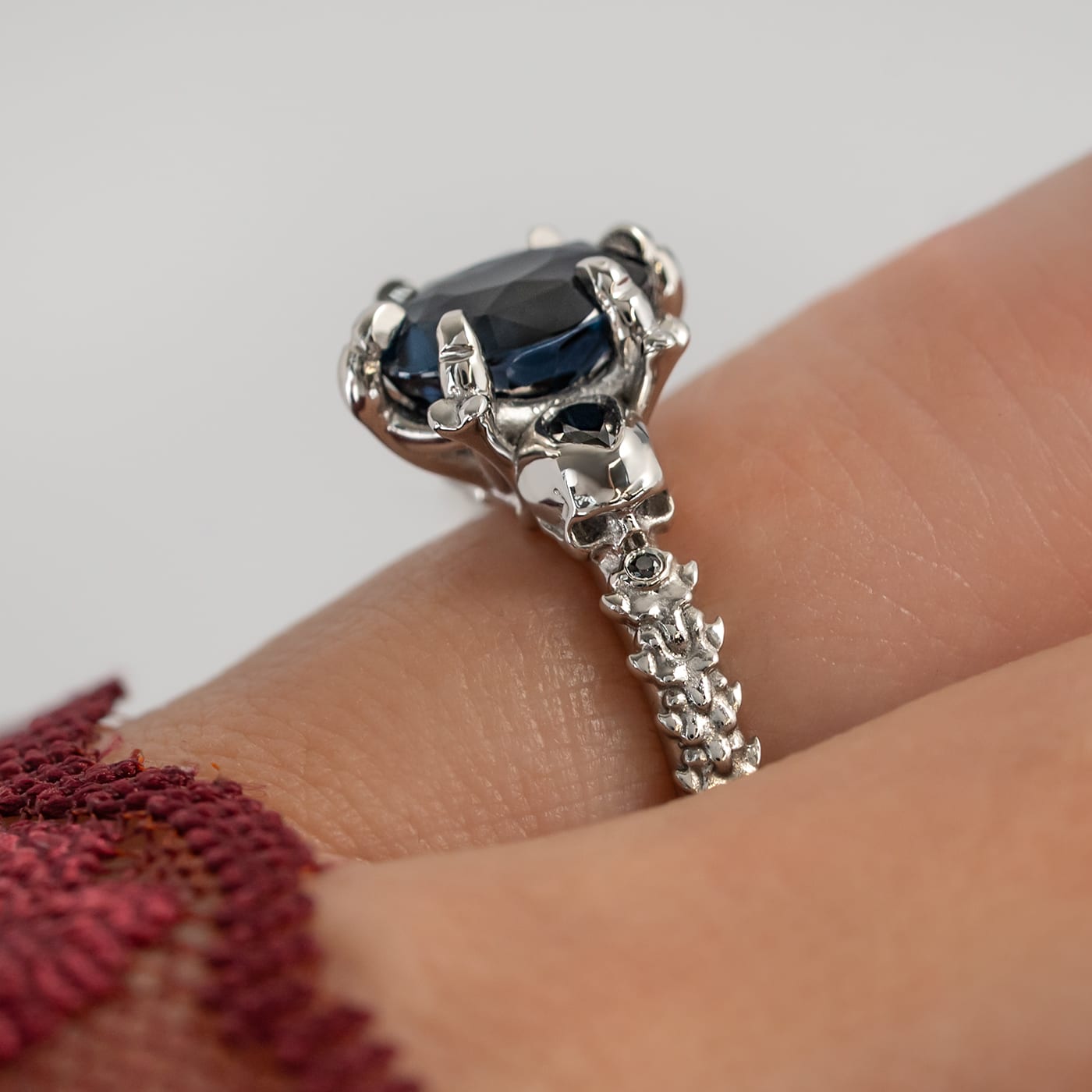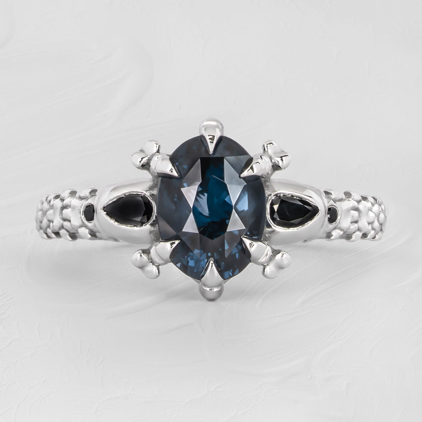 Introducing a new gothic style engagement ring, it features a talon set blue spinel at its center, surrounded by black diamonds that glimmer with mysterious fire. Intricate skull and bone details wrap the band, making it the perfect ring for those who love alternative styles.