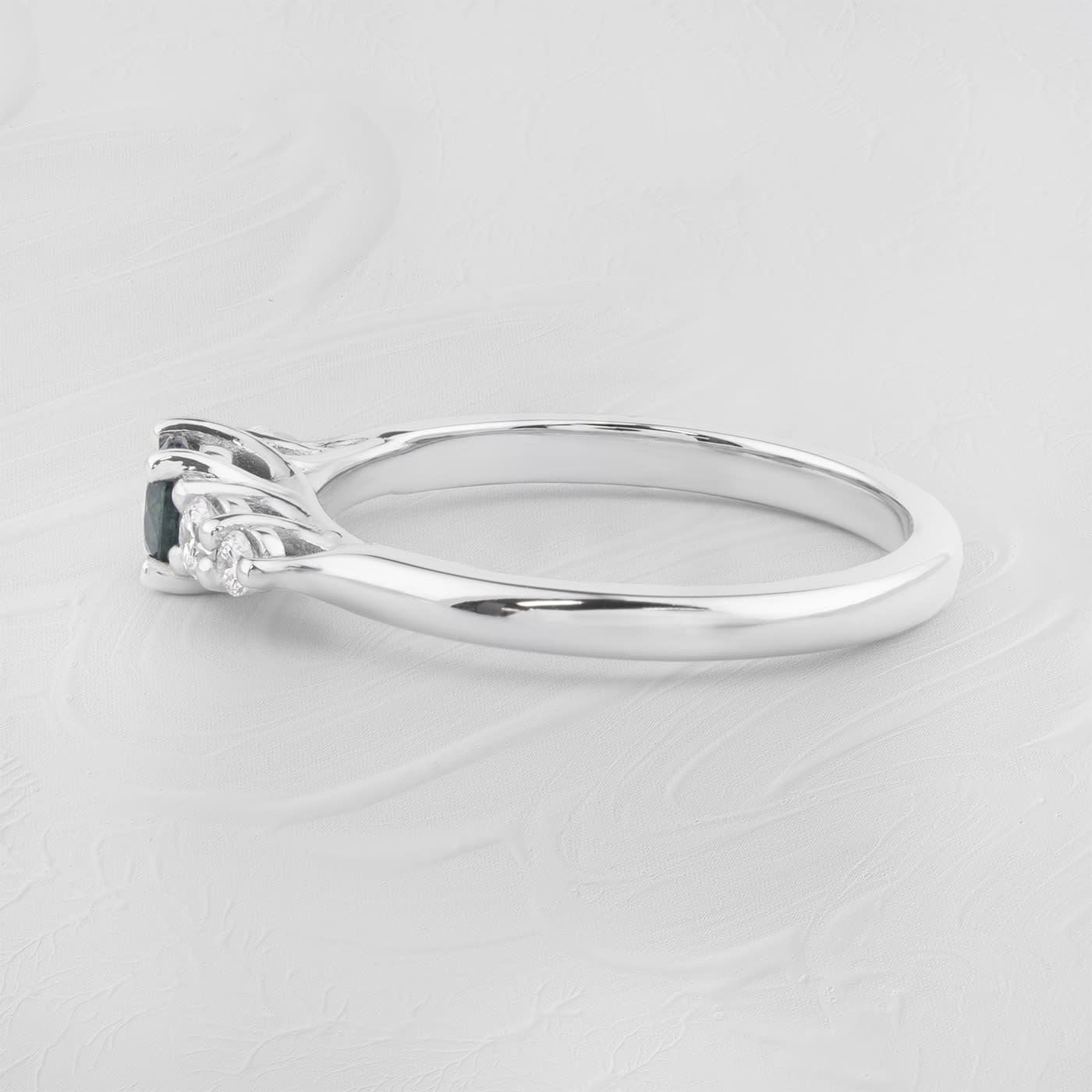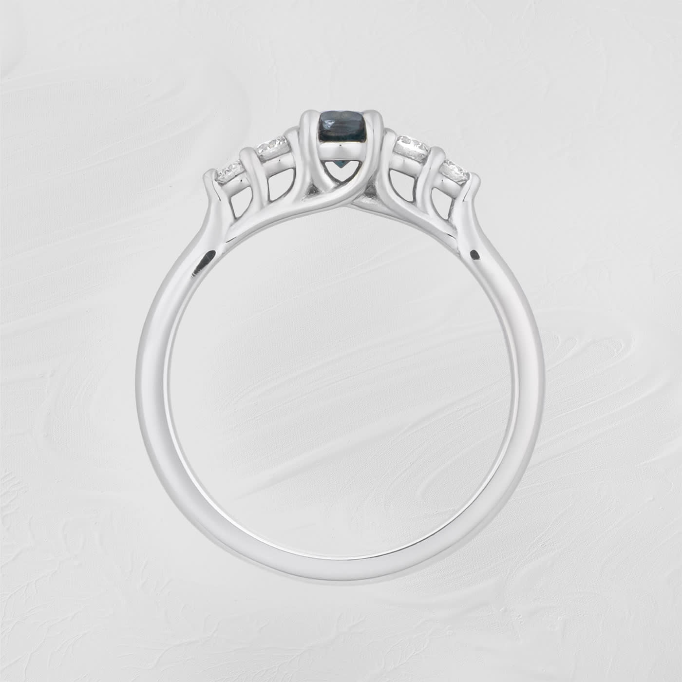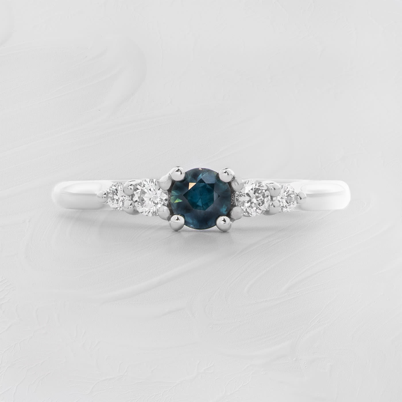 Description: The Quintet is a five-stone fine jewellery ring featuring a central round cut teal sapphire, totalling 0.43ct, set in a petite trellis setting. This engagement ring design incorporates four lab-grown round accent stones, adding 0.14ct total carat weight to the piece. The trellis setting and open gallery design ensure the stones are secure while maximising light access and natural brilliance.