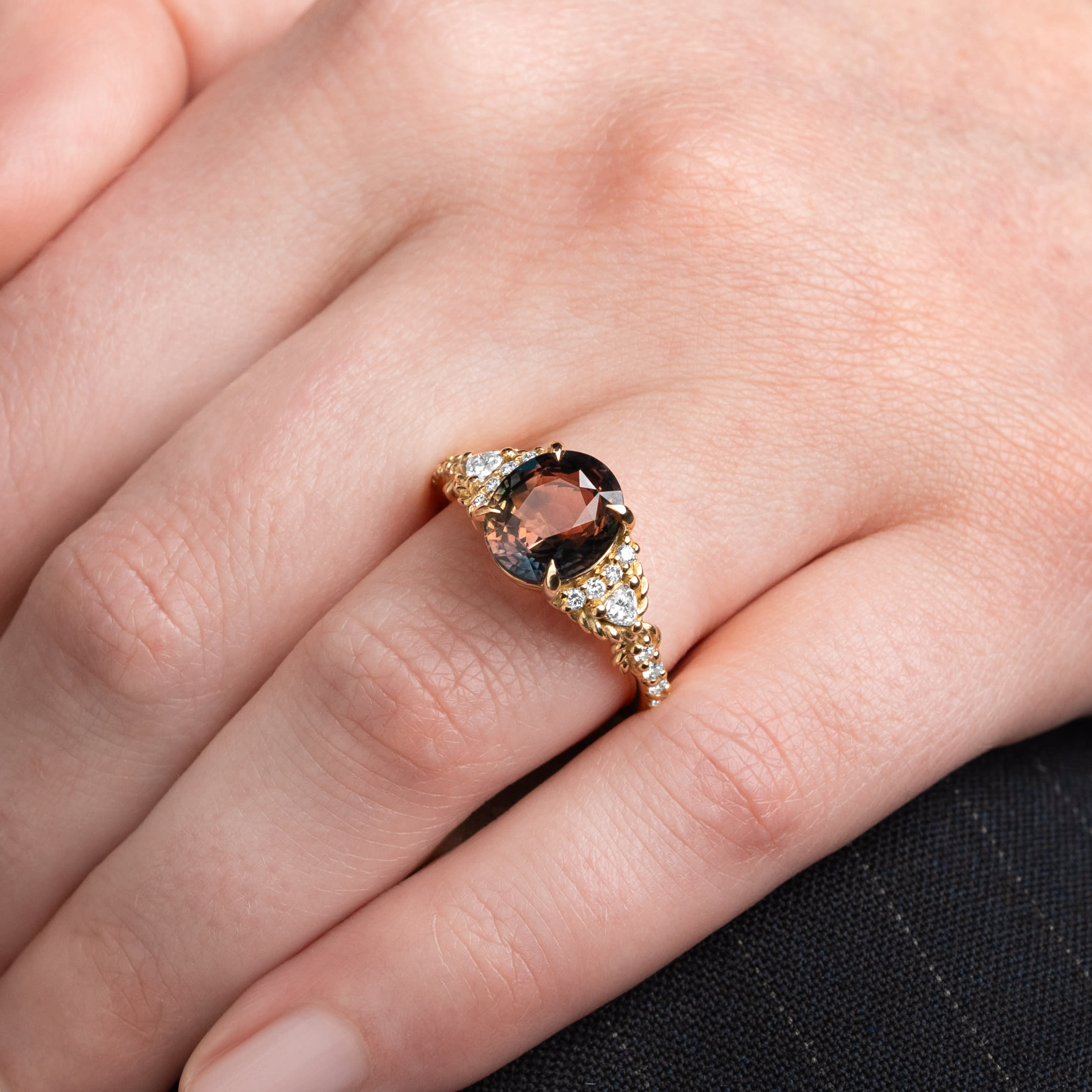 Description: This bi-colour orange and brown sapphire engagement ring features a 3.63ct oval parti colour natural sapphire set in an intricate 18ct yellow gold mount. The centre stone is flanked by two trillion-cut diamonds and 16 brilliant-cut round diamonds, detailed with a rope-style setting. This fine jewellery piece is a unique ring design with prominent accent stone placement.