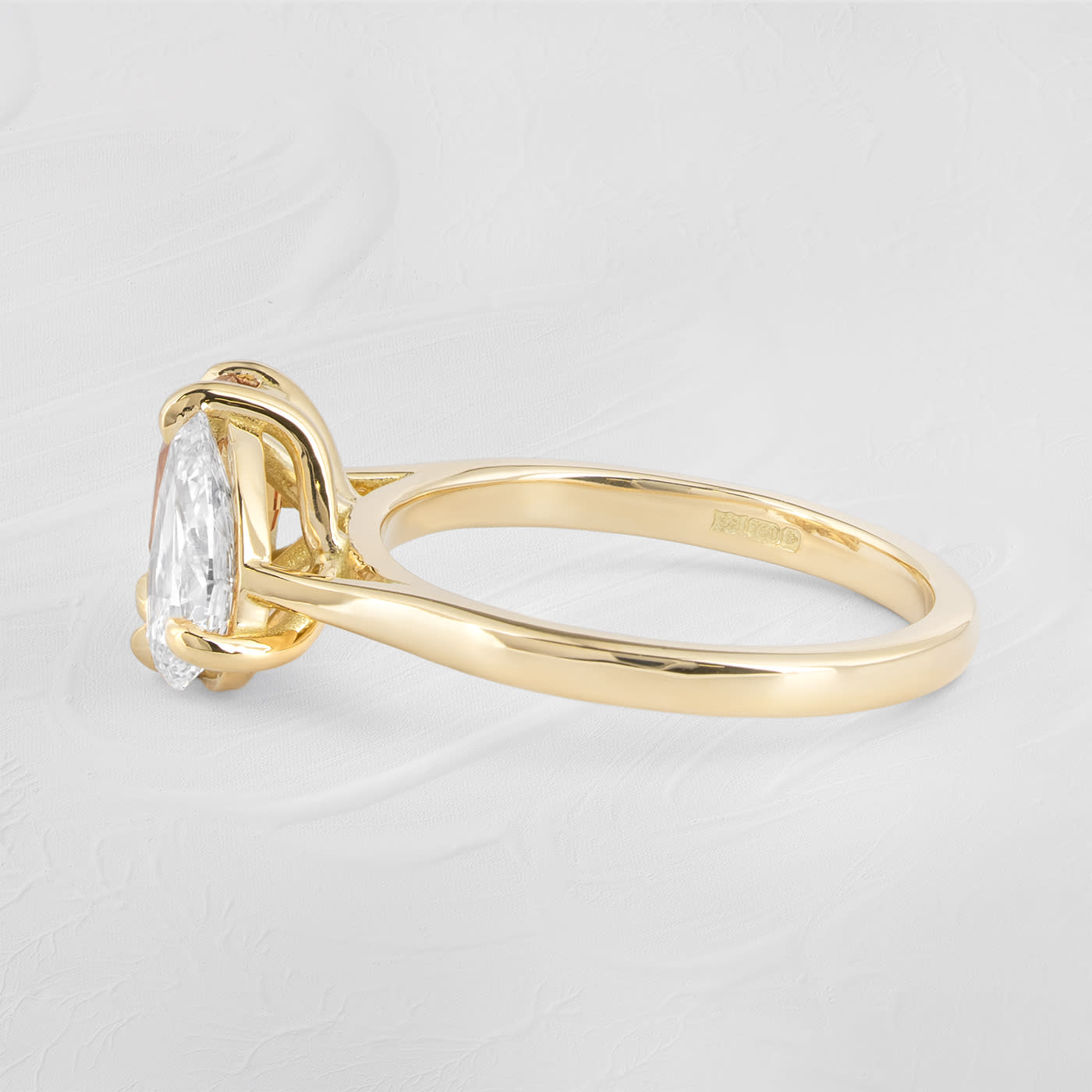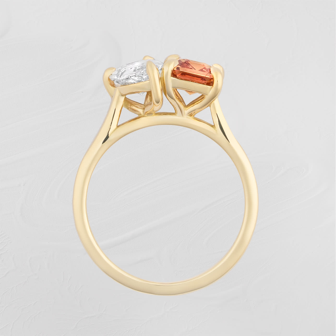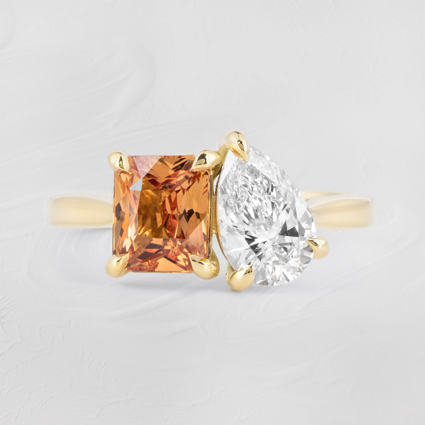 This beautiful new ring features a radiant cut unheated orange sapphire and a pear cut lab grown diamond, talon set in a Toi Et Moi style. The gems have been paired in an 18ct yellow gold cathedral style setting!