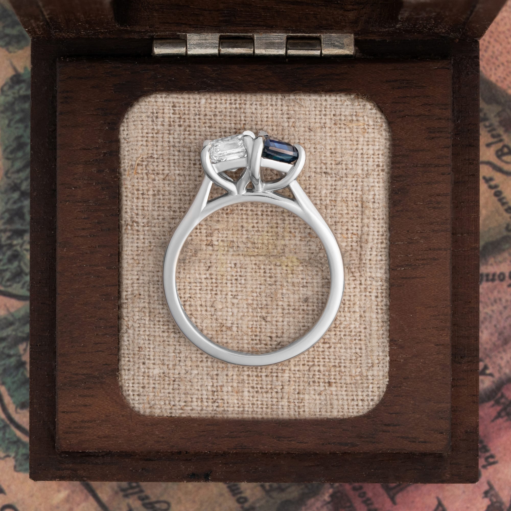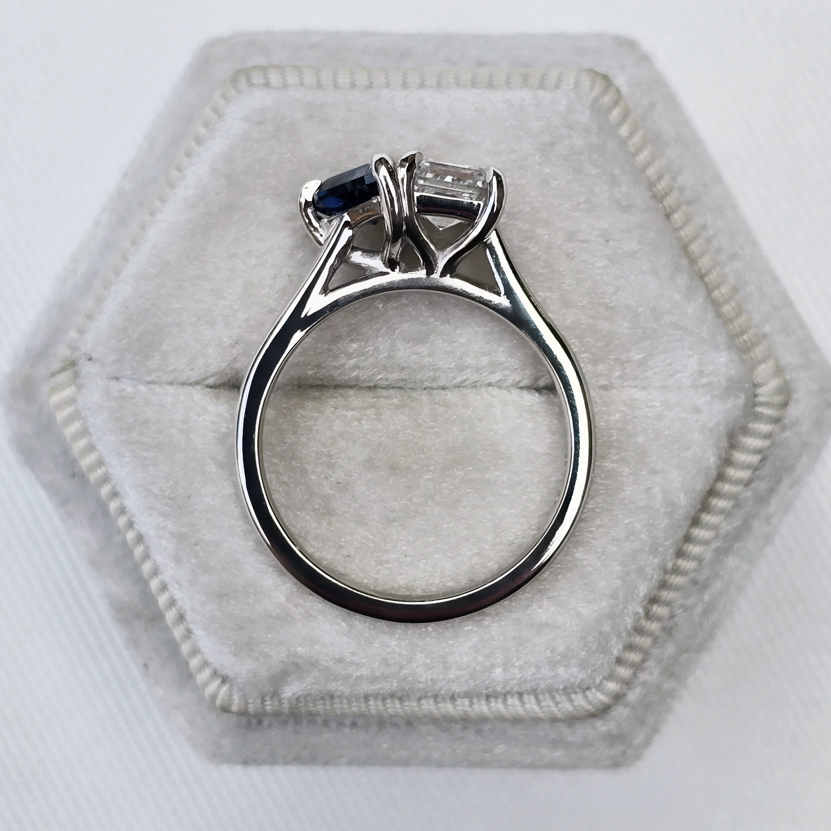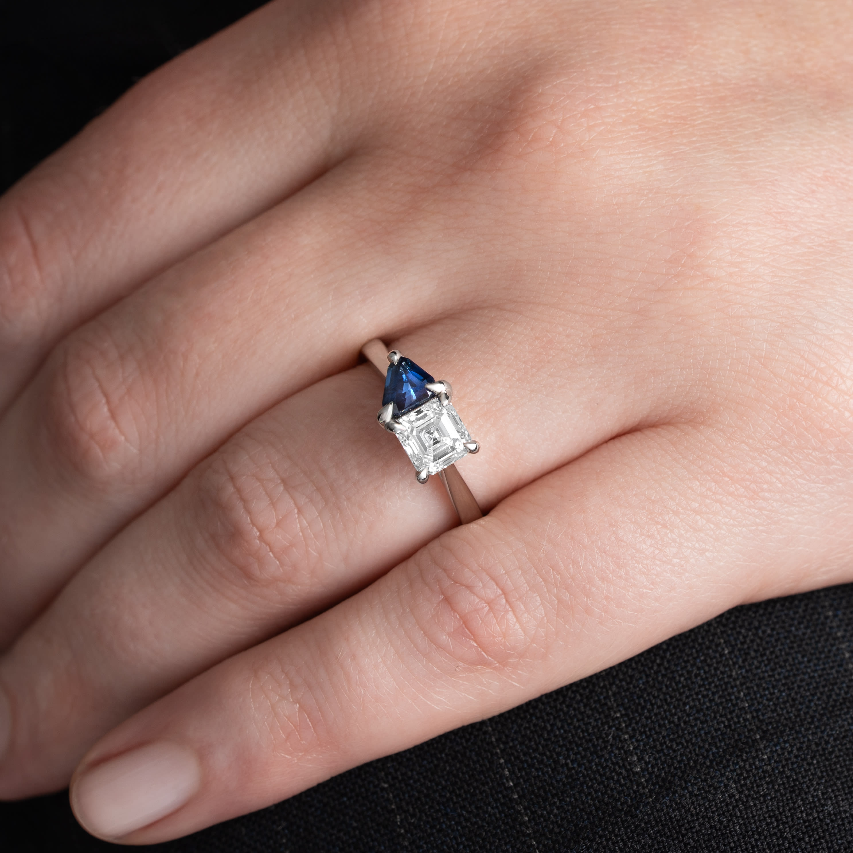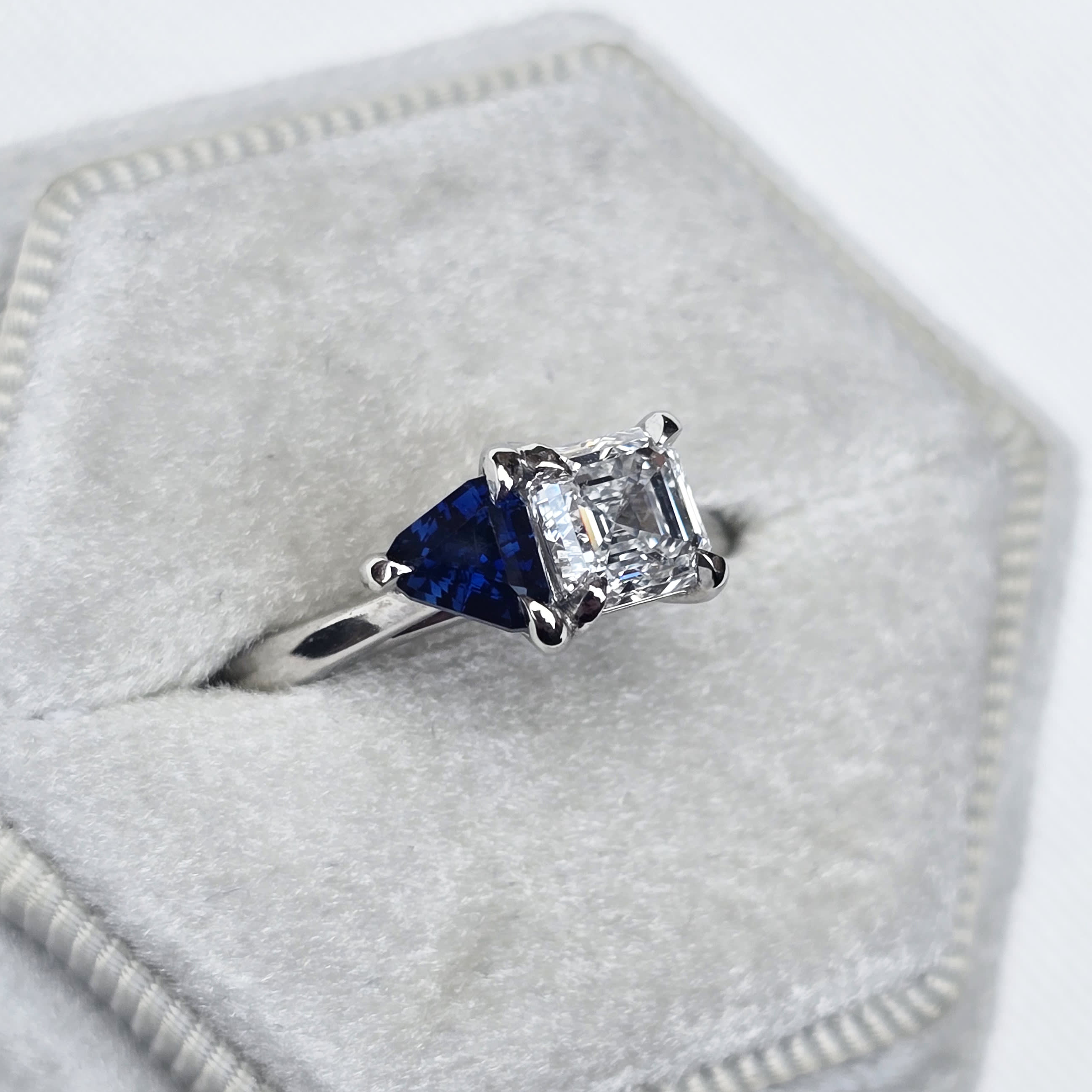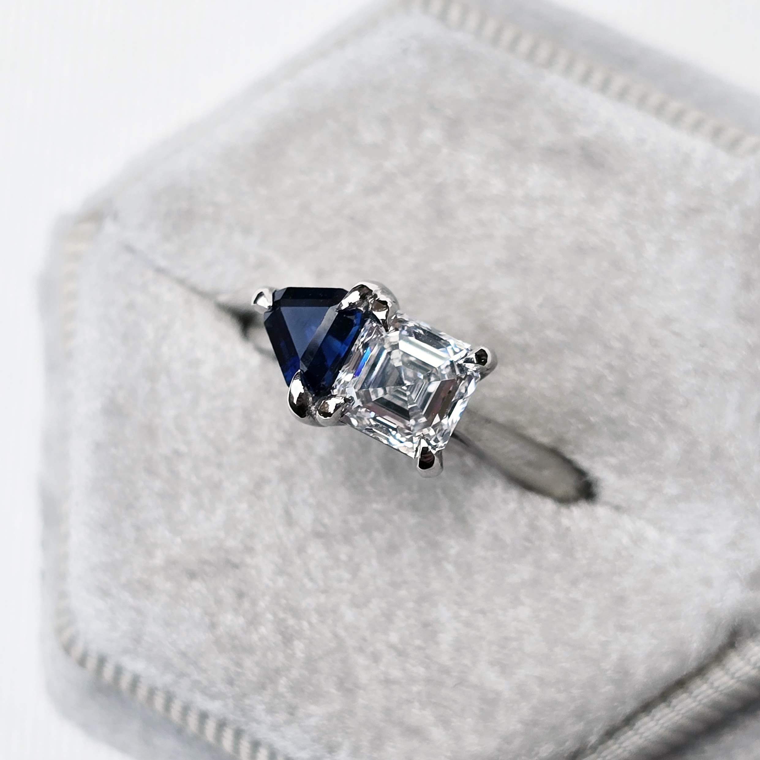 This beautiful new ring features a trillion cut natural blue sapphire and an asscher cut lab grown diamond, talon set in a Toi Et Moi style. The gems have been paired in a platinum cathedral style setting!