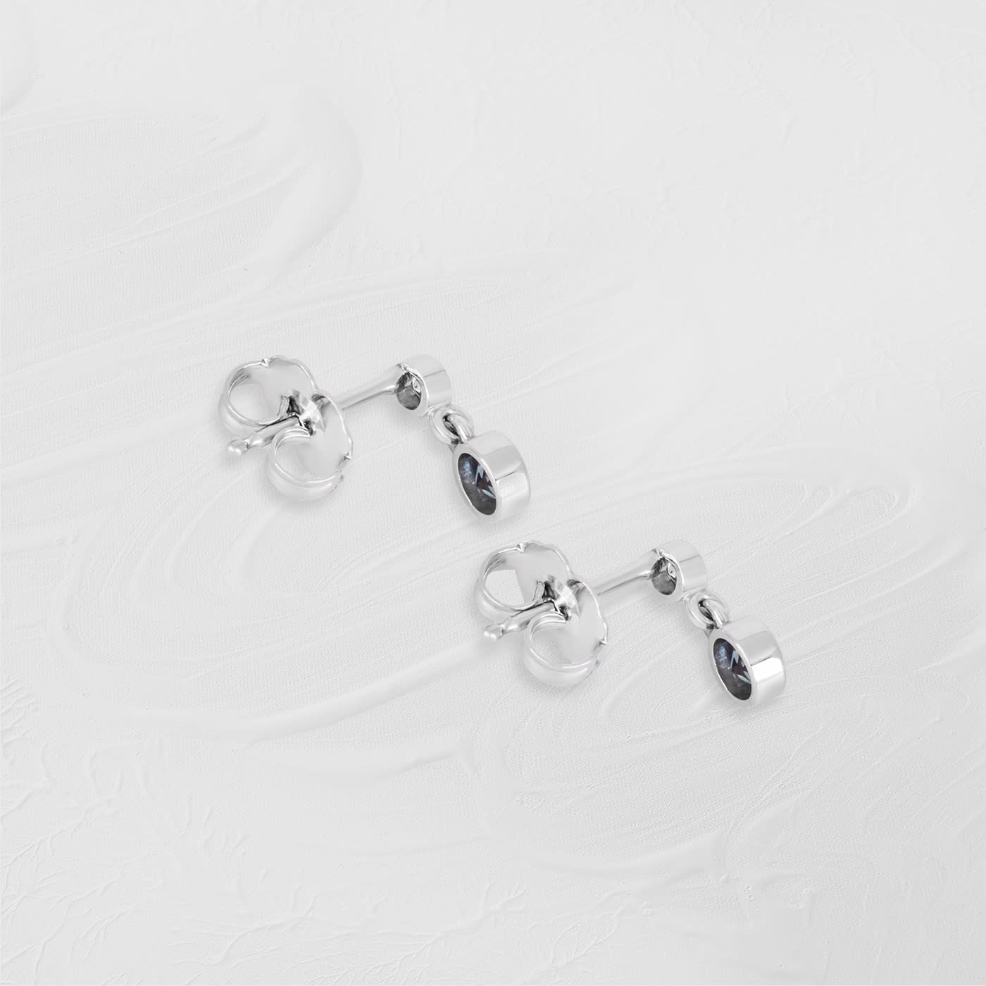 These brand new stud style earrings feature a bezel set lab grown alexandrite and accent natural diamond, all in a 14ct gold drop style stud earring.