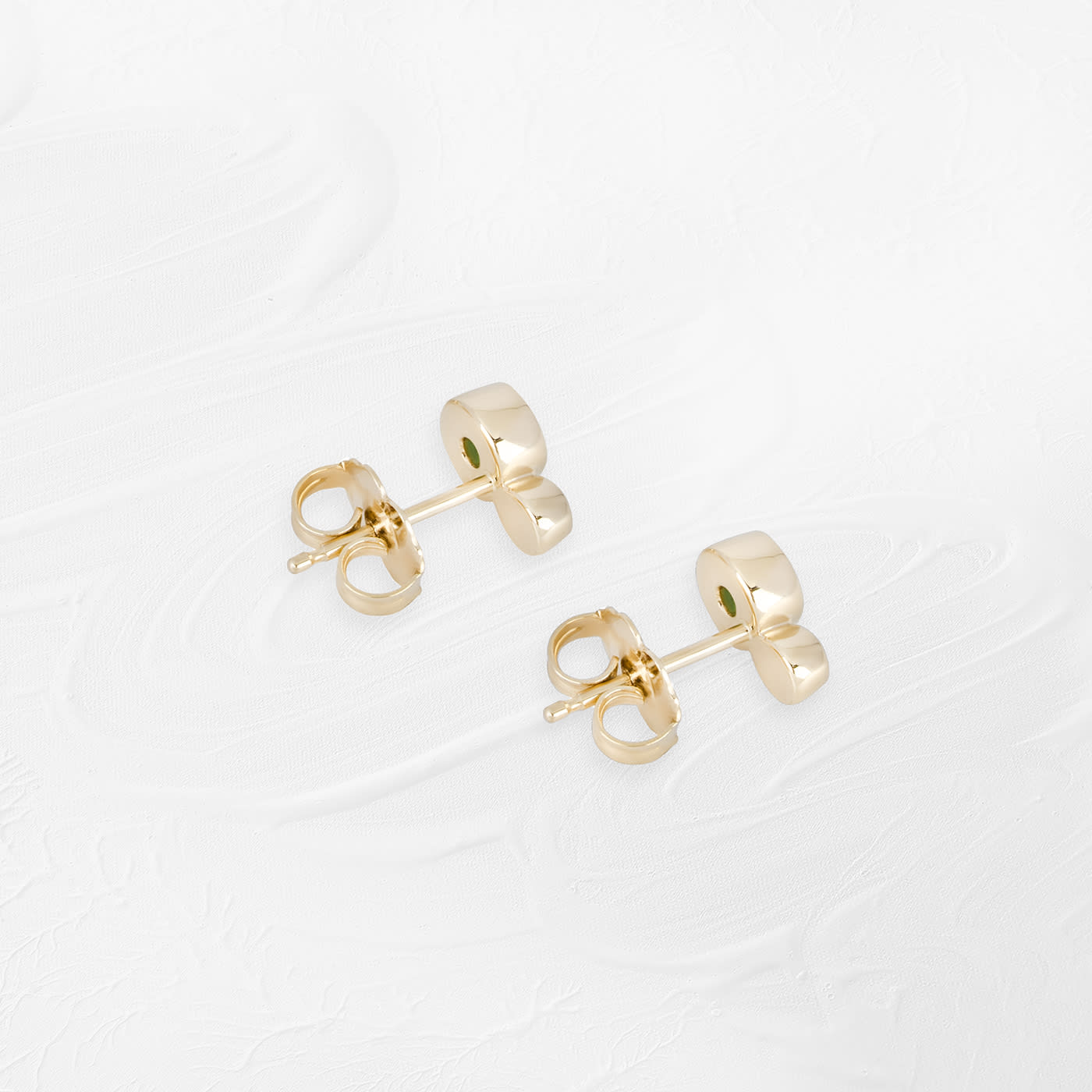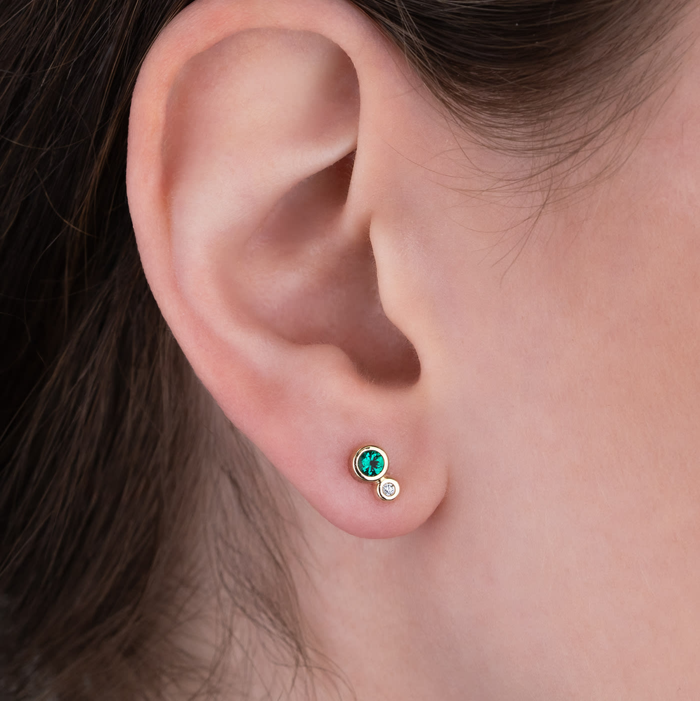 These brand new stud style earrings feature a bezel set lab grown emerald and accent offset natural diamond, all in 14ct gold.