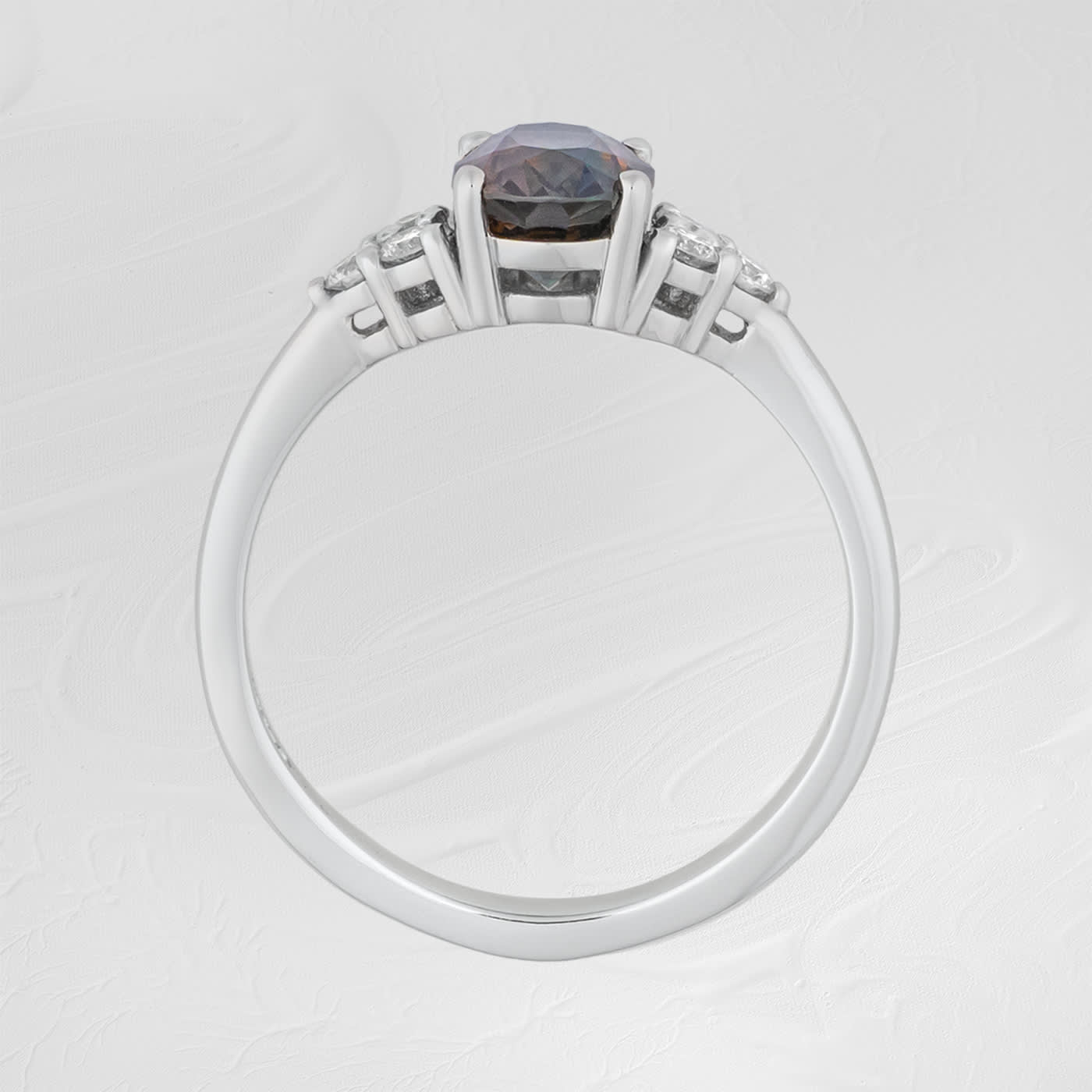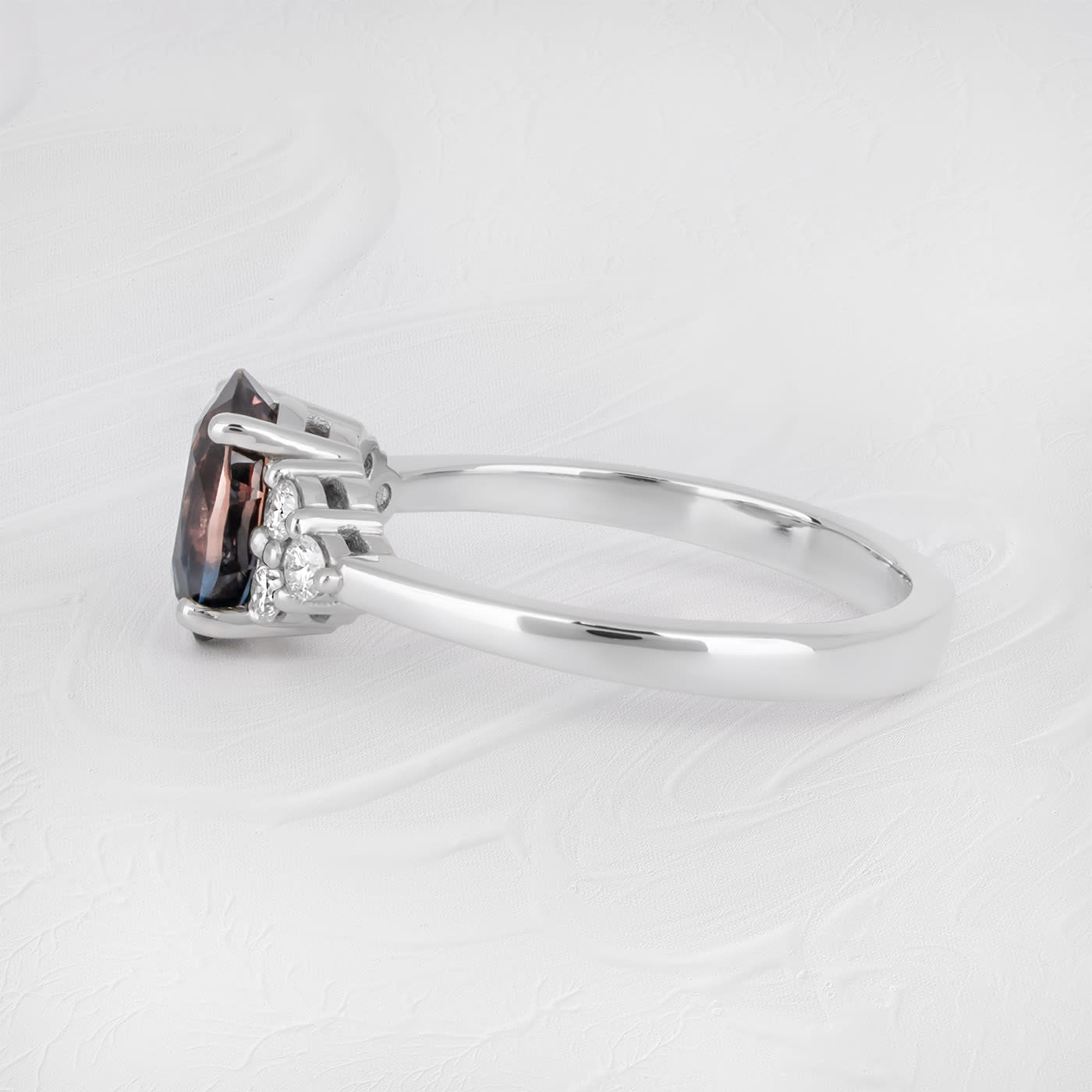 This absolutely gorgeous ring features a beautiful, unheated, 2.06ct oval parti sapphire that displays mesmerising Autumnal hues. It is set with 6 diamonds flanking on either side in a classic 7 stone platinum mount!