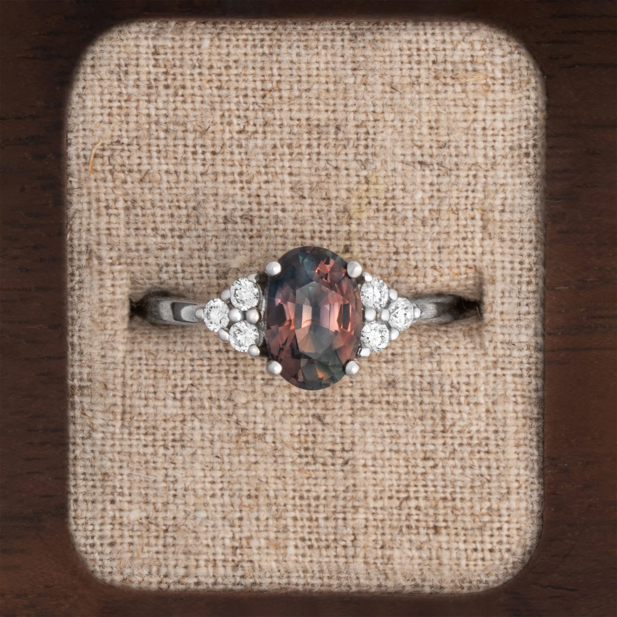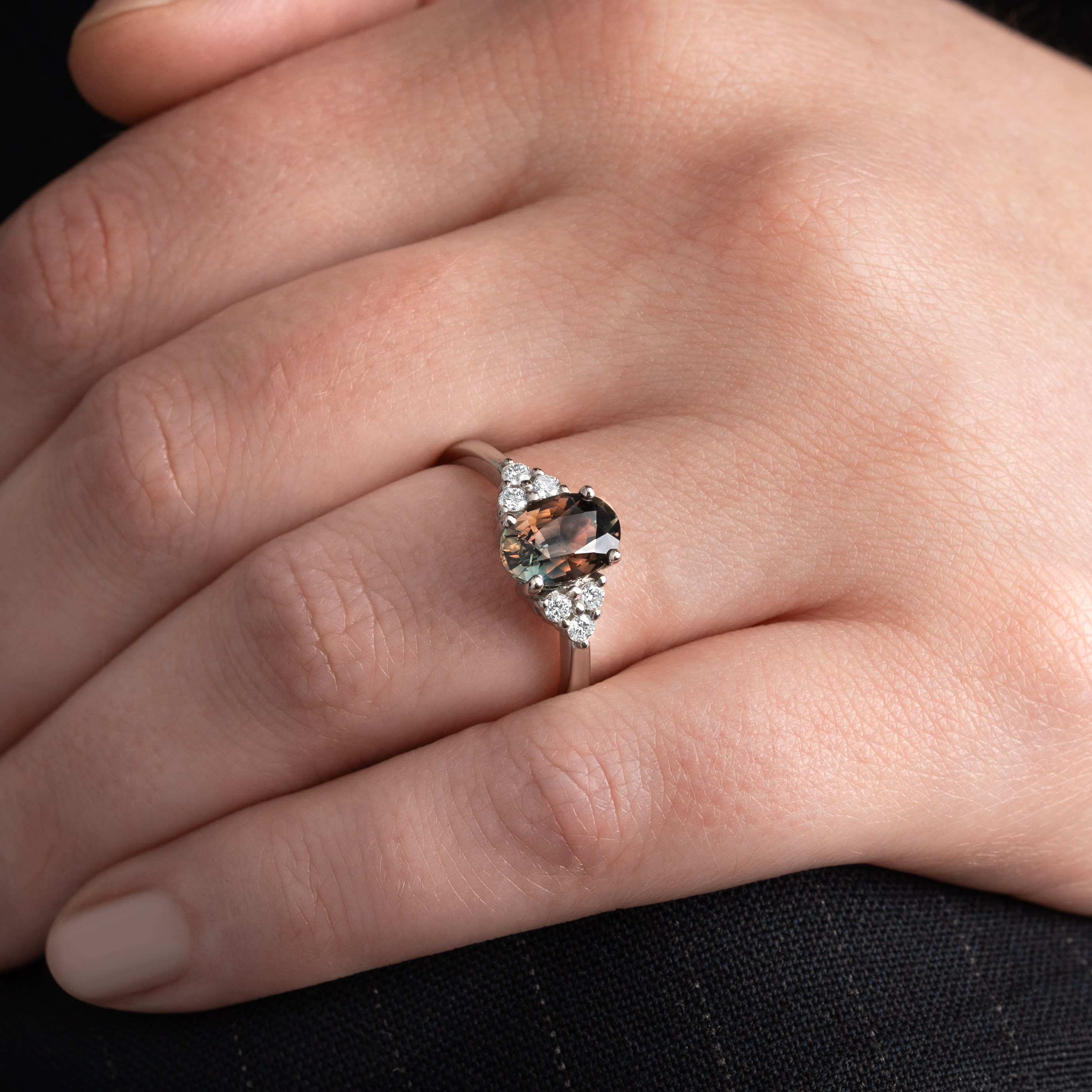 Description: This seven-stone engagement ring features an oval parti sapphire centre stone, weighing 2.06 carats, flanked by three round diamonds on each side. The natural sapphire displays green, brown, and orange colouration. This fine jewellery piece is secured in a classic platinum mount, suitable for daily wear.