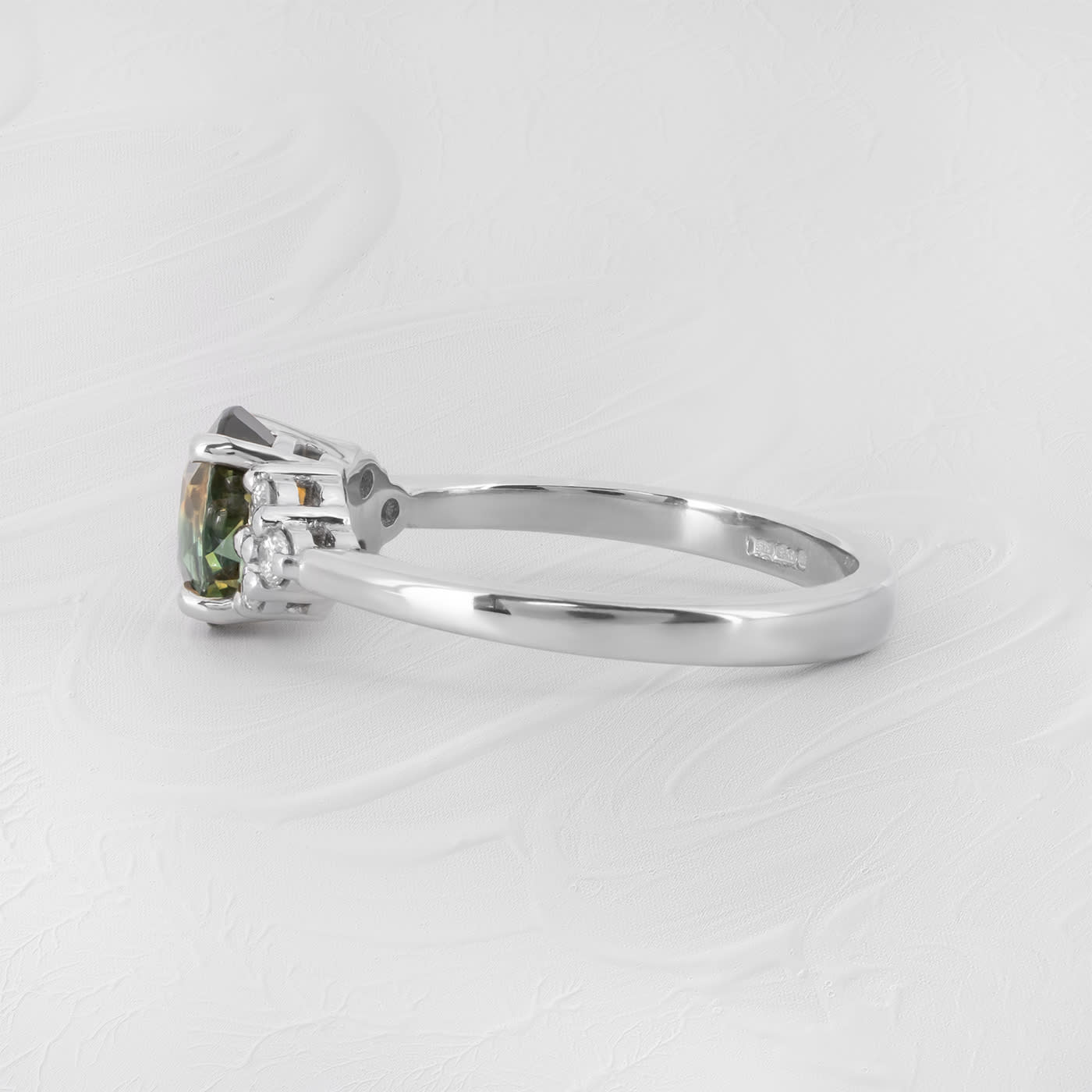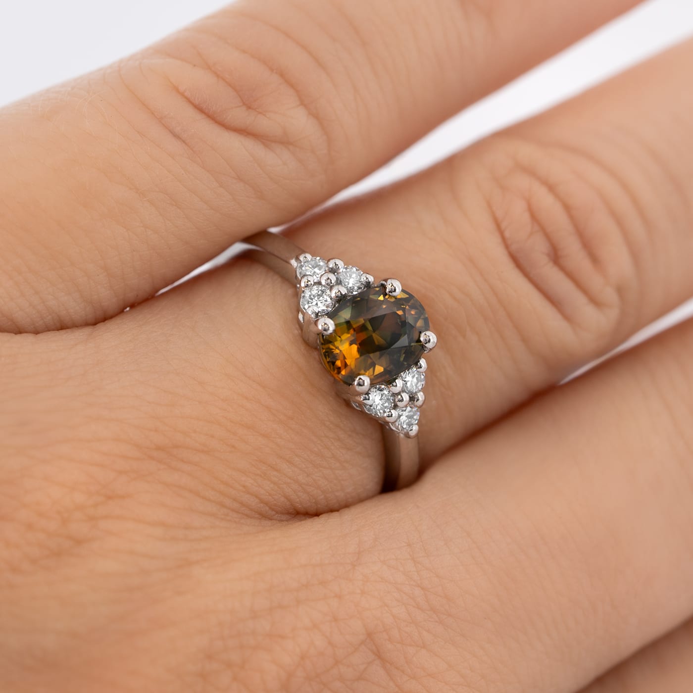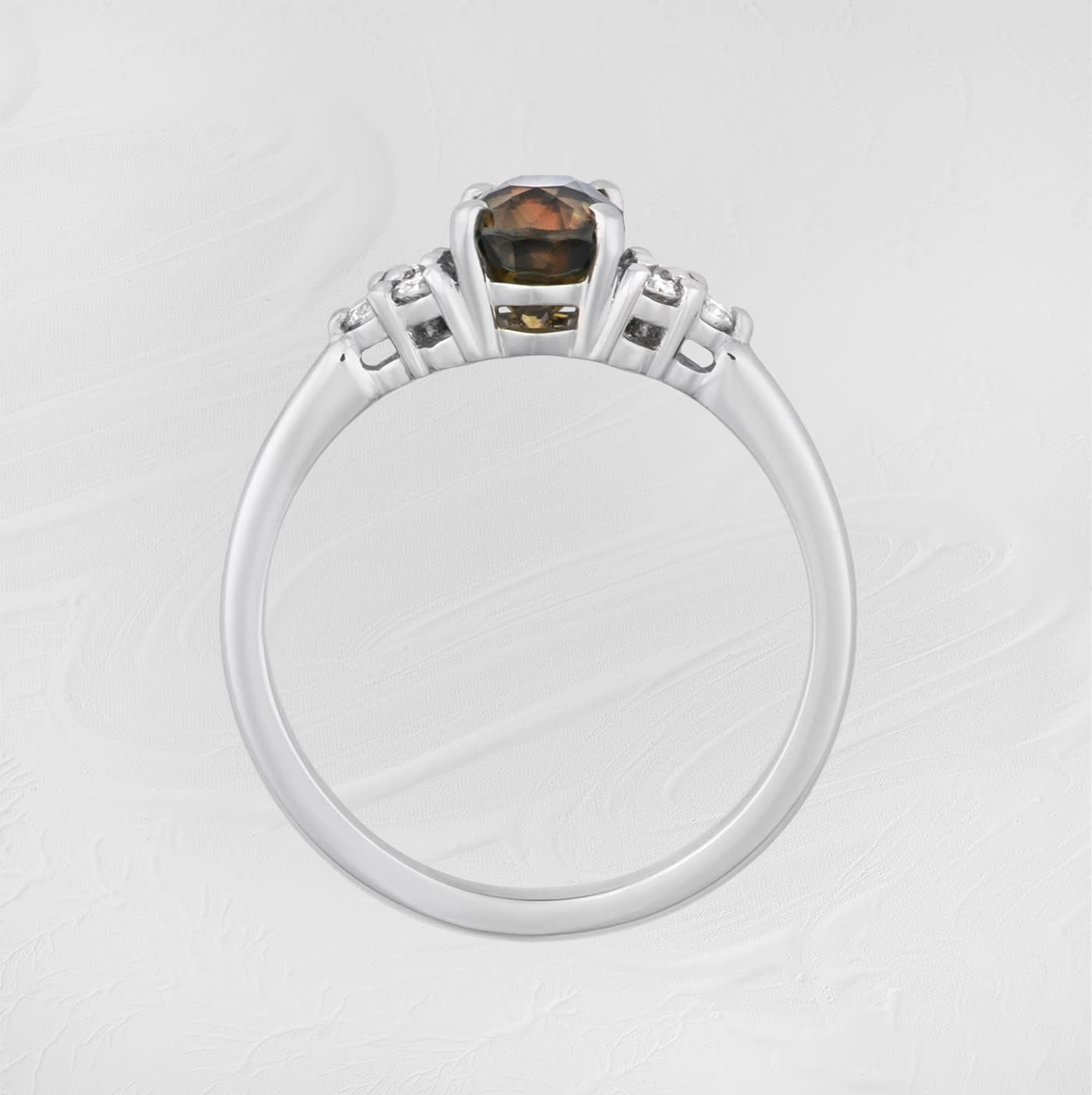 This absolutely gorgeous ring features a beautiful 1.80ct oval parti sapphire that displays mesmerising Autumnal hues. It is set with 6 diamonds flanking on either side in a classic 7 stone platinum mount!