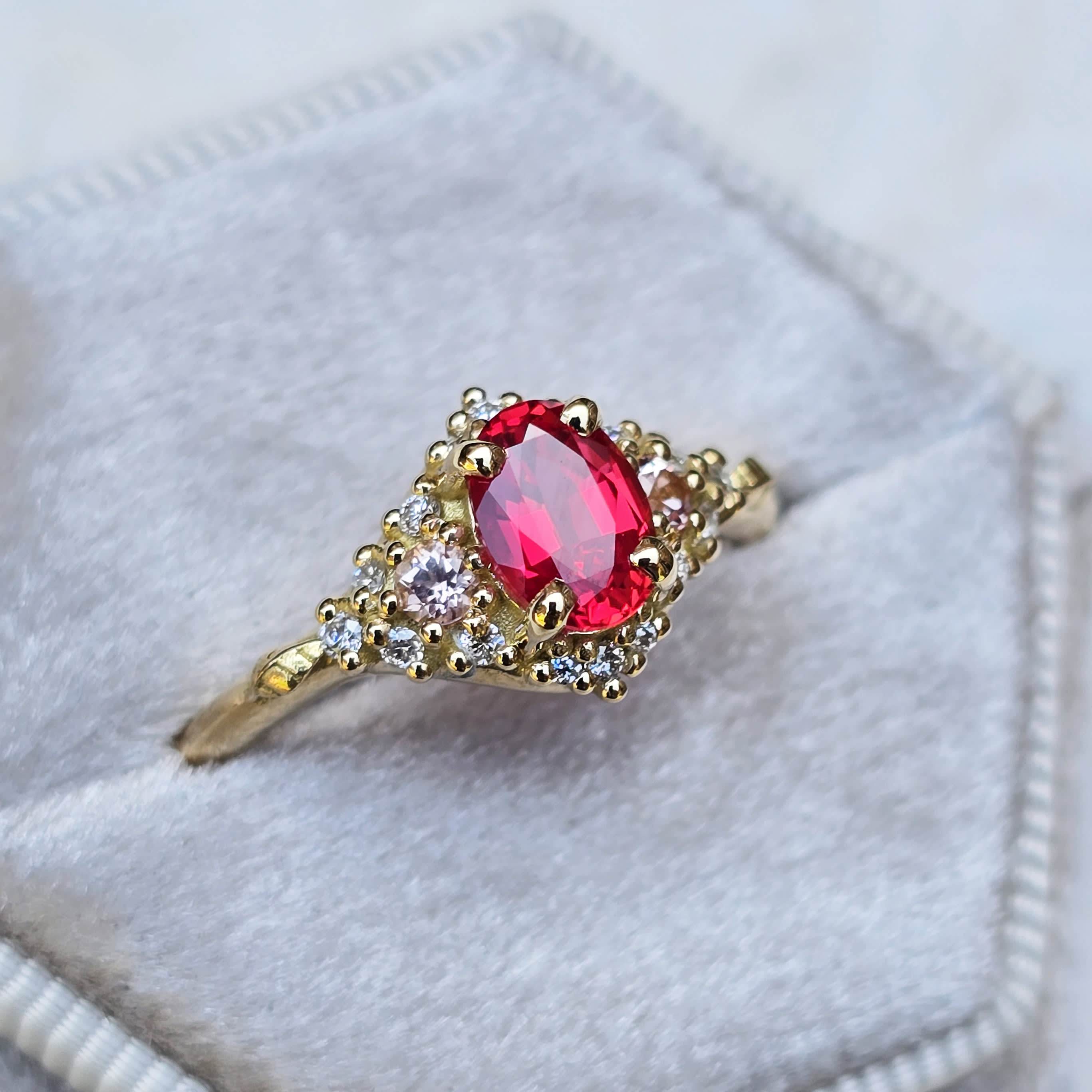 This beautiful nature inspired ring features a central Chatham grown oval cut medium toned padparadscha sapphire, nestled amongst a cluster of Chatham champagne sapphires and lab grown diamonds. At the end of the cluster lies two subtle leaves to accentuate the woodland theme. The ring is pictured in 18ct yellow gold!
