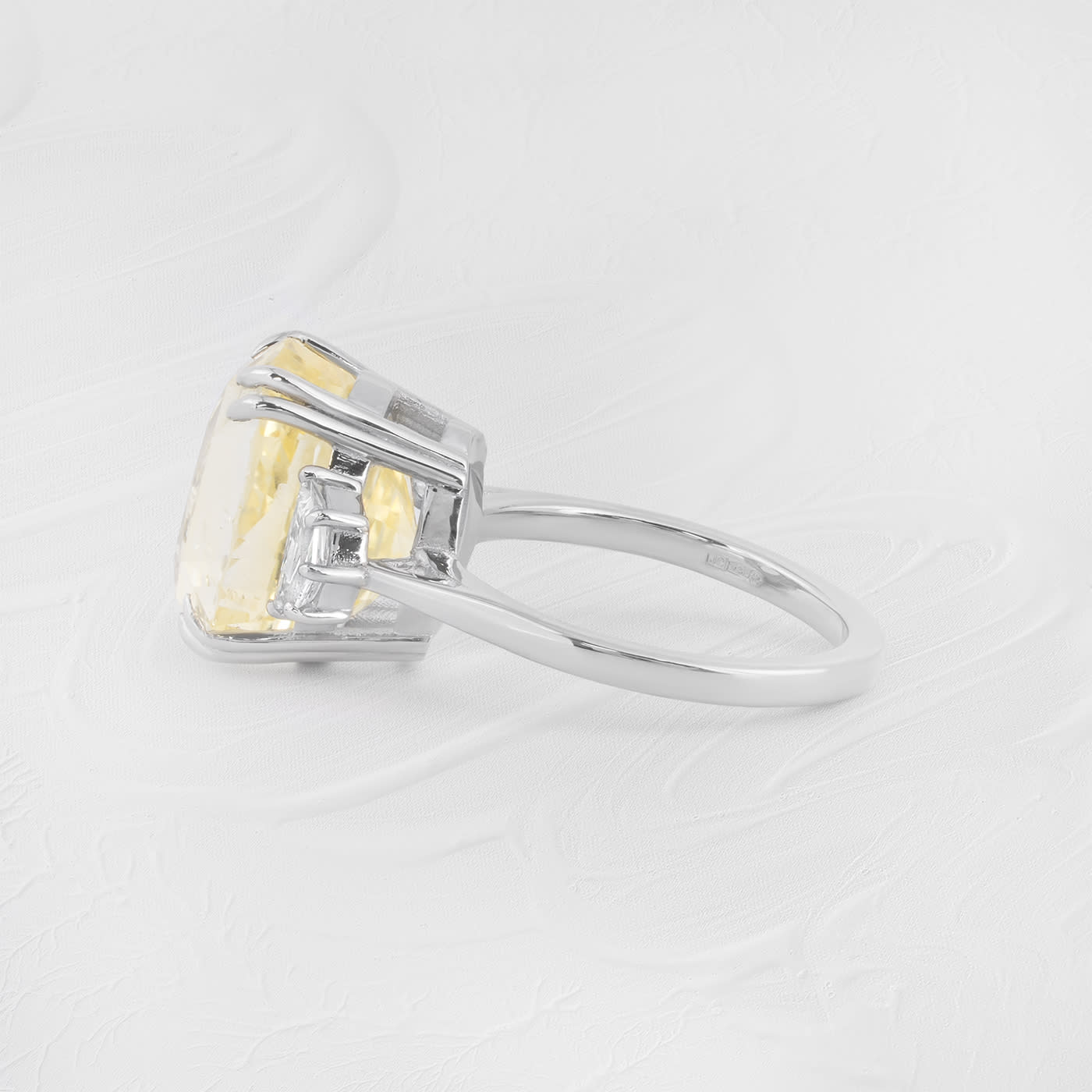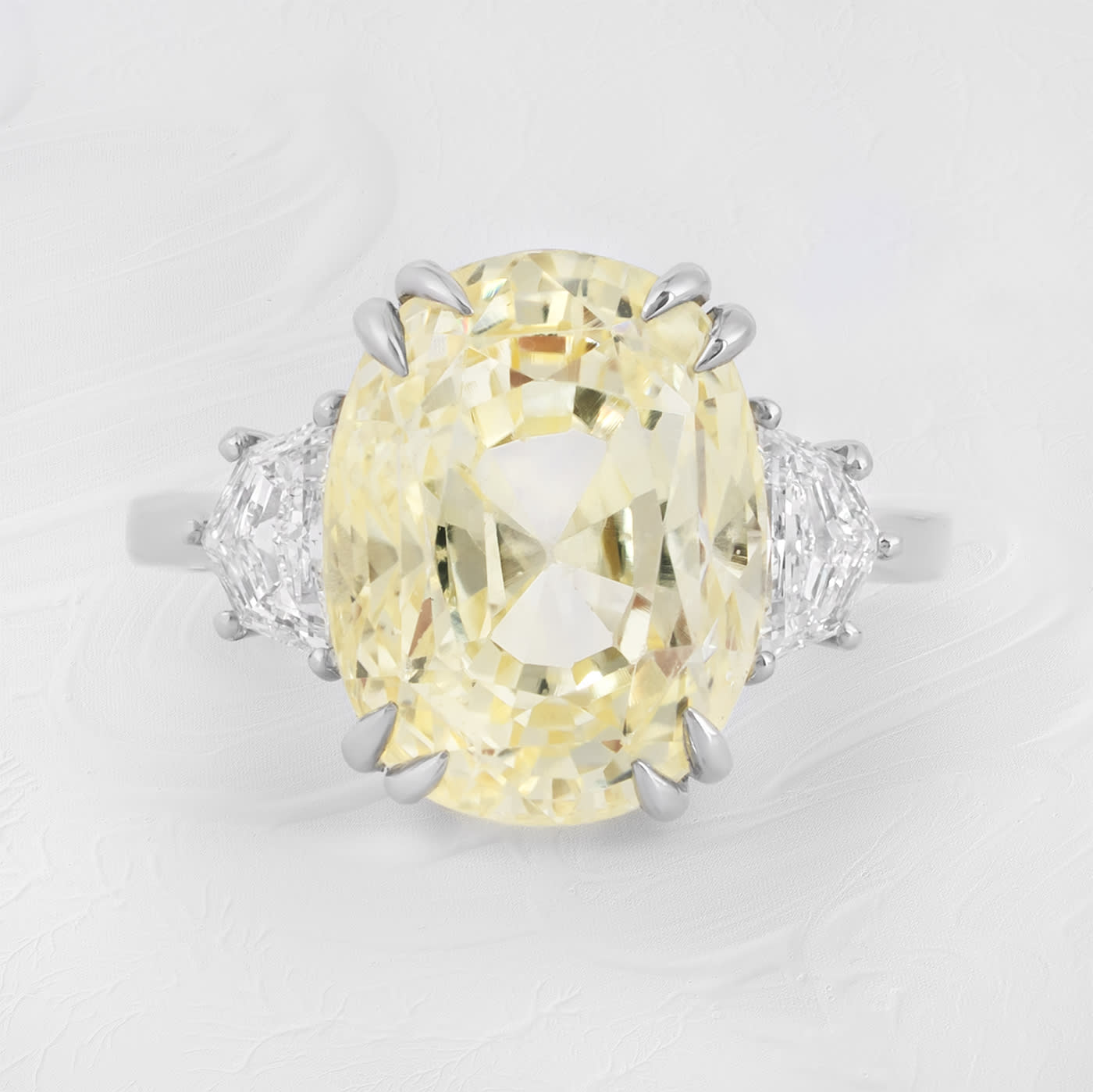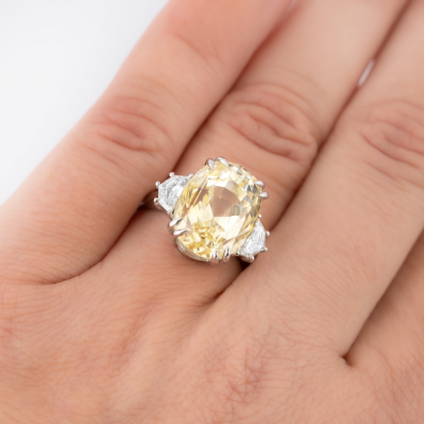 Description: This trilogy ring features a large oval mixed-cut natural yellow sapphire centre stone, secured by twin talons. It is flanked on either side by epaulette cut natural diamonds. The ring is a pre-made piece of fine jewellery with an antique influence.